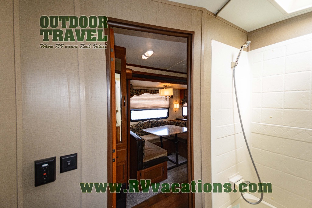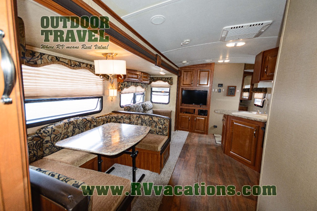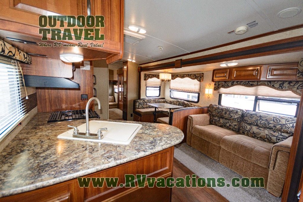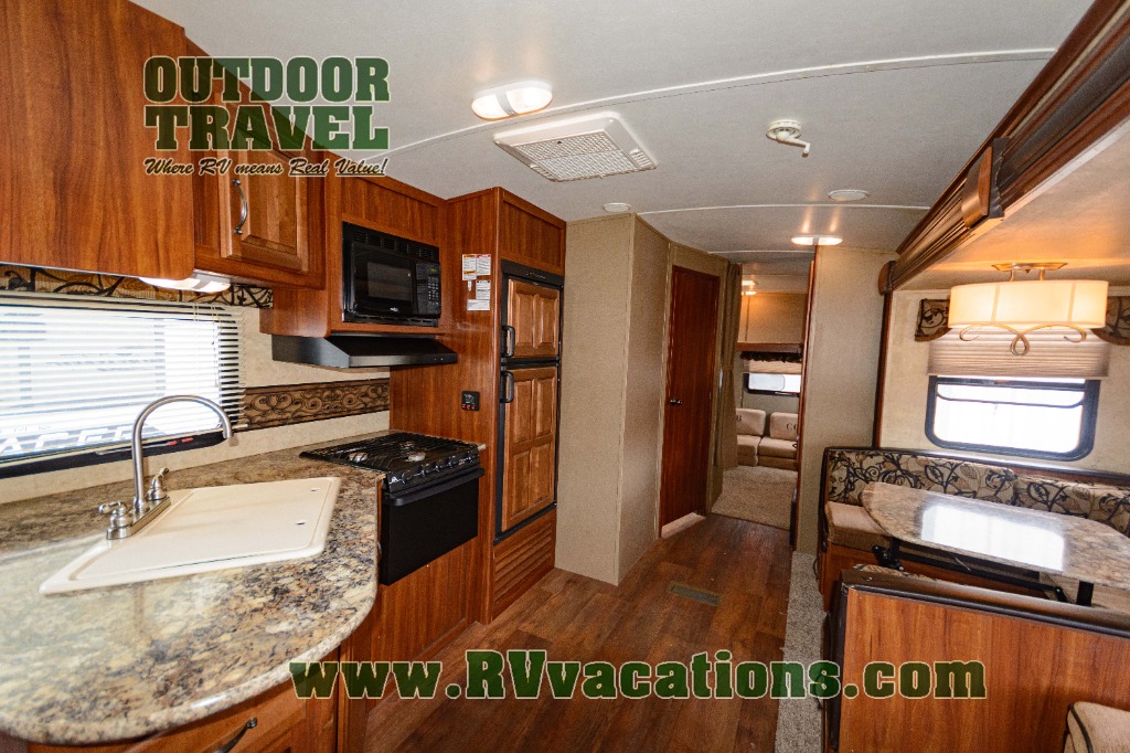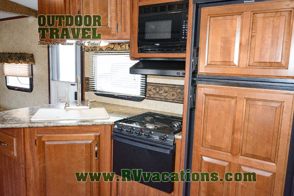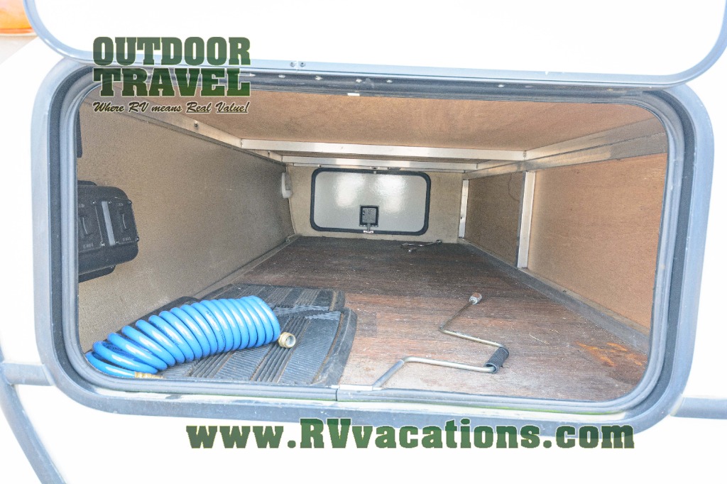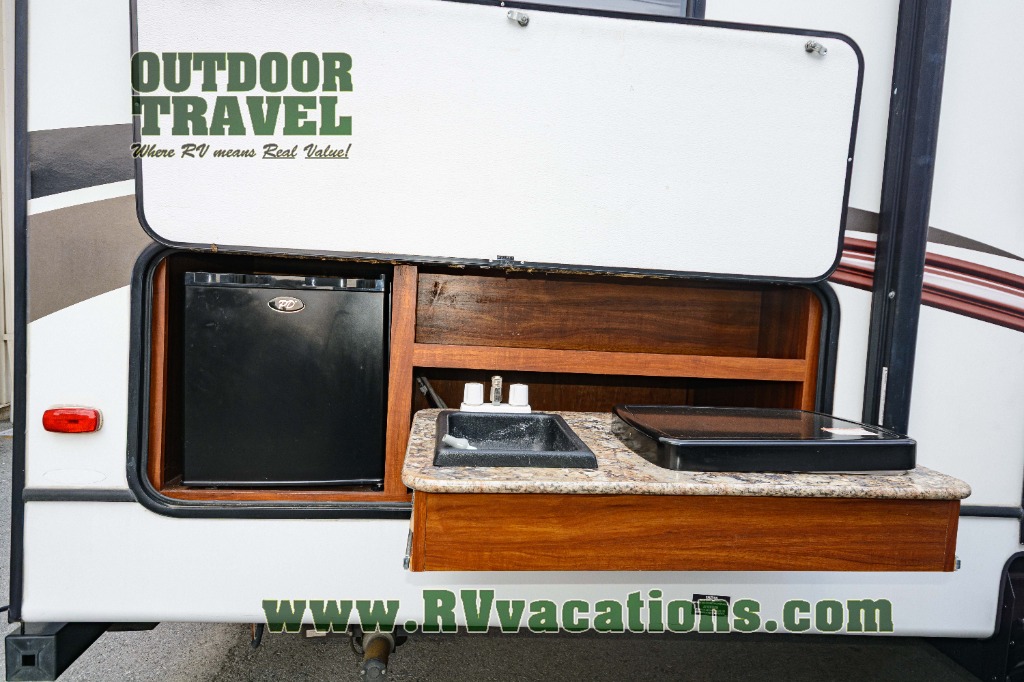 Outside the family chef will enjoy cooking and grilling with a handy refrigerator, counter top, single sink, and two burner stove top at the pull-out exterior kitchen in the rear. The front offers a pass-through storage compartment that is perfect for all of your outdoor gear, and so much more!