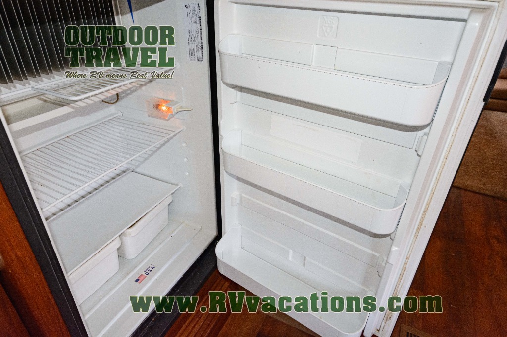 On the opposite side of the slide there is a kitchen where you can easily whip up a meal or snacks for your hungry crew. There is a refrigerator, three burner range, microwave oven, and double kitchen sink too. Plus a pantry located just off the dinette slide for storing all of your dry and canned goods.
