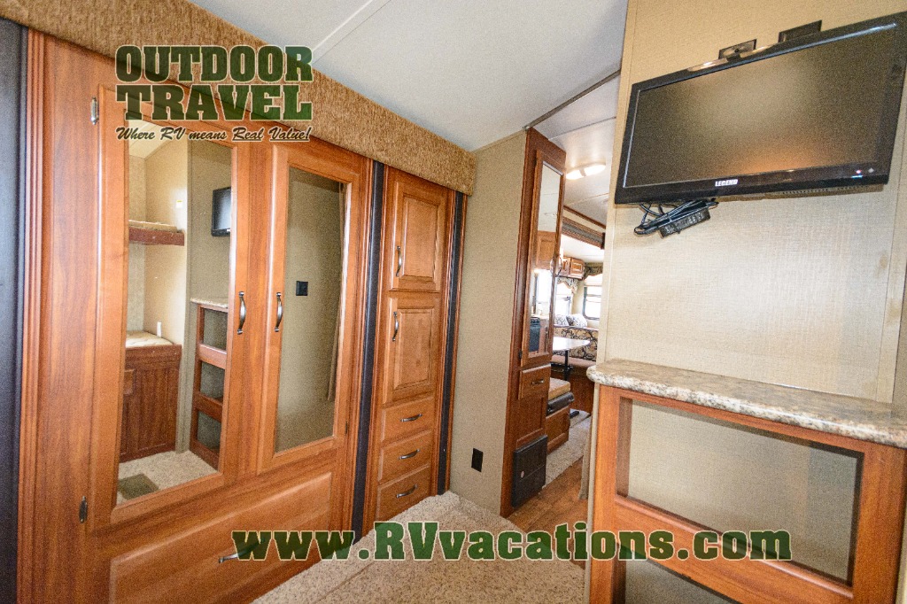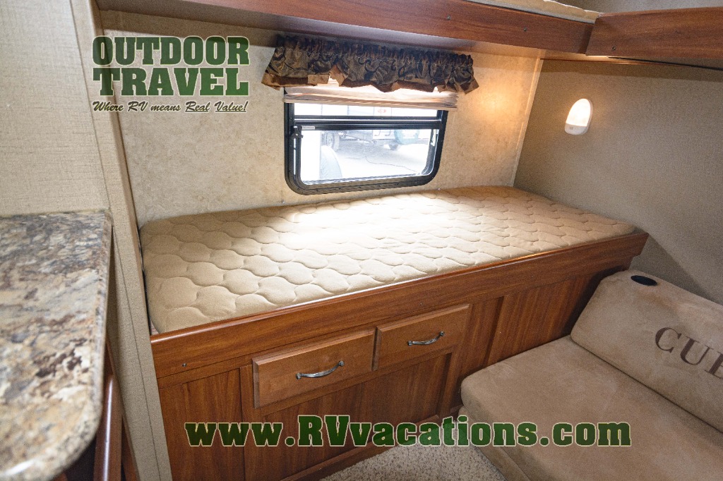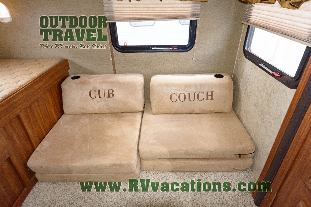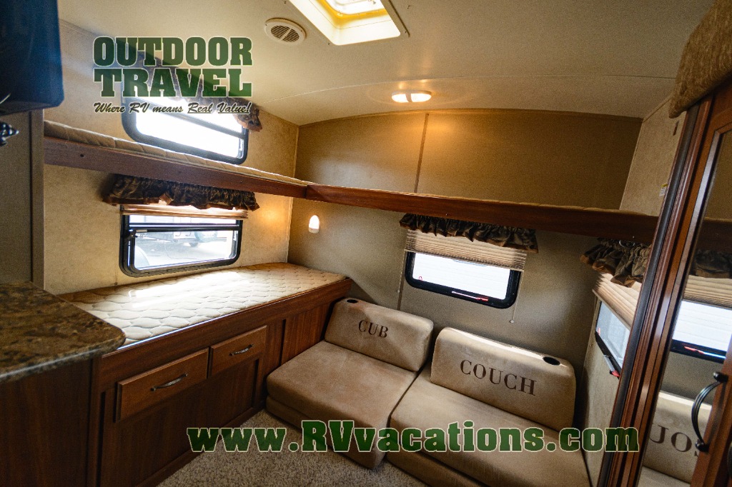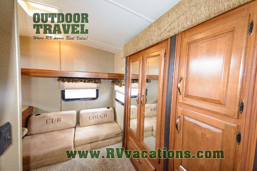 The rear is where you will most likely find the kids hanging out when they are not enjoying the outdoors. There is a large wardrobe slide on the right as you enter. A cub coach straight ahead with a flip-up bunk above, and a set of 28" x 74" bunks on the left side. There is also a 19" LCD TV mounted on the wall for enjoyment.