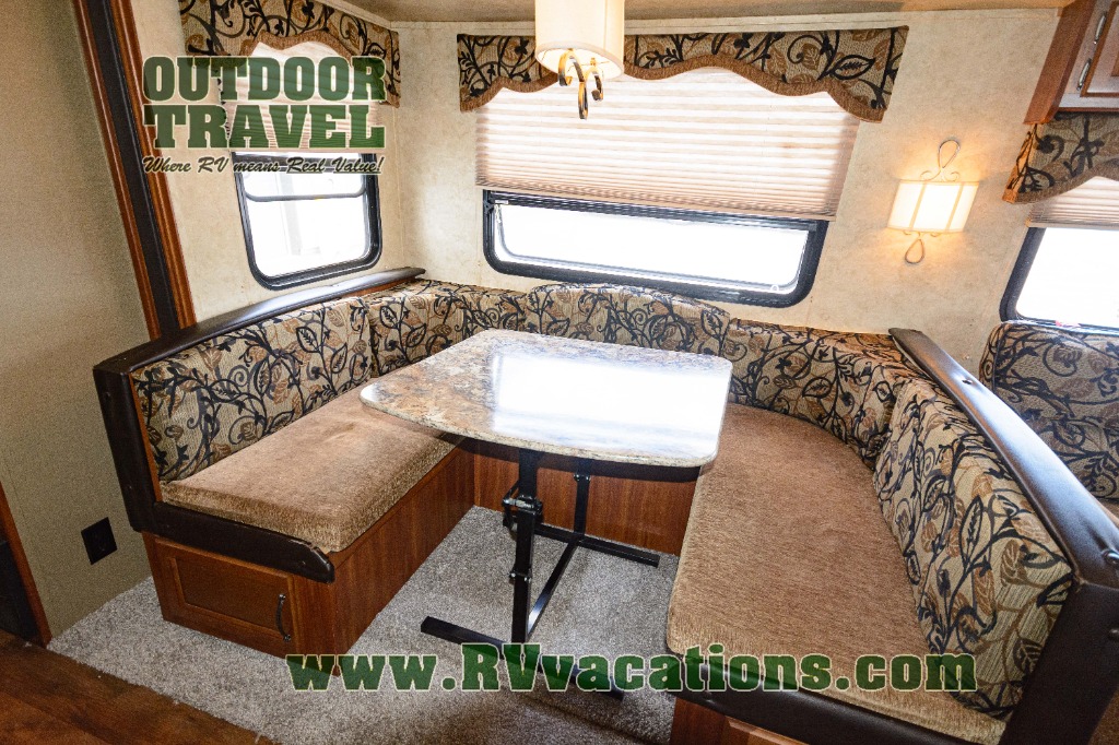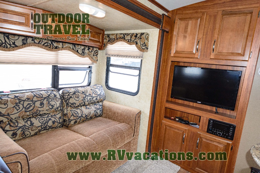In the combined kitchen and living area there is a large slide out hide-a-bed sofa and u-shaped dinette for plenty of seating during mealtime and just hanging out. Watch television on the 32" LCD TV provided.