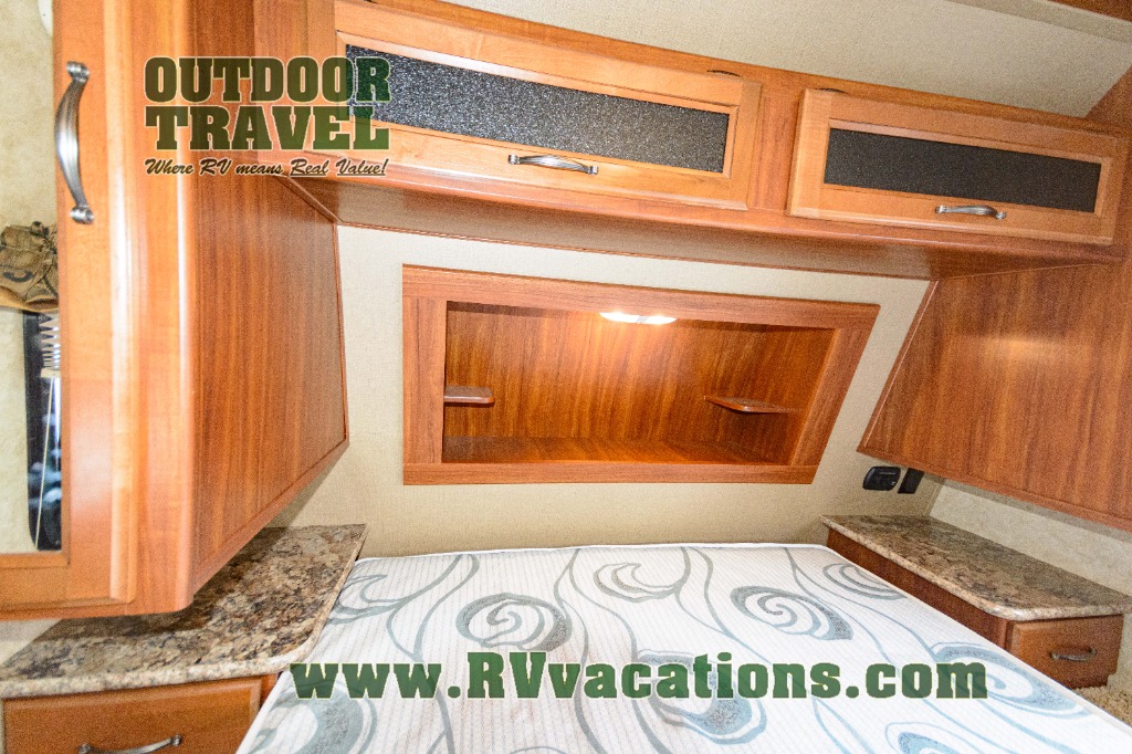 Step inside the front most entry door and see the bedroom to the right featuring a queen bed with dual wardrobes, overhead storage, and a laundry chute.