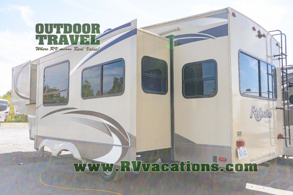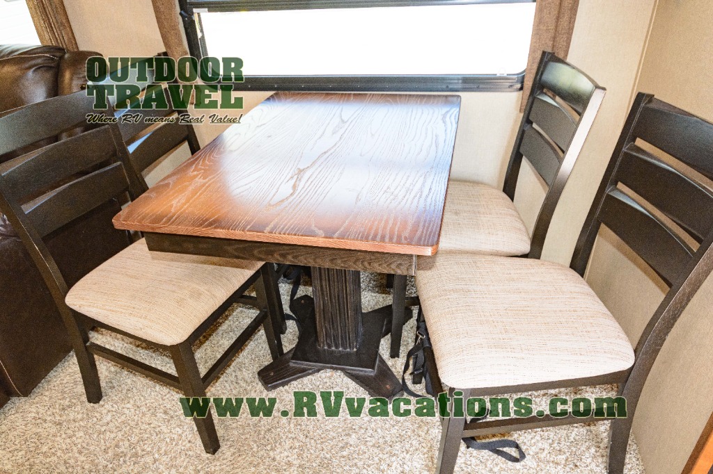Across the rear wall of this Reflection unit you will enjoy a tri-fold hide-a-bed sofa with storage cabinets above to store more camping items. Adjacent, in the second living area slide out you will find theater seating for two and an optional free standing dinette instead of a booth dinette.