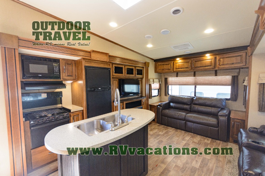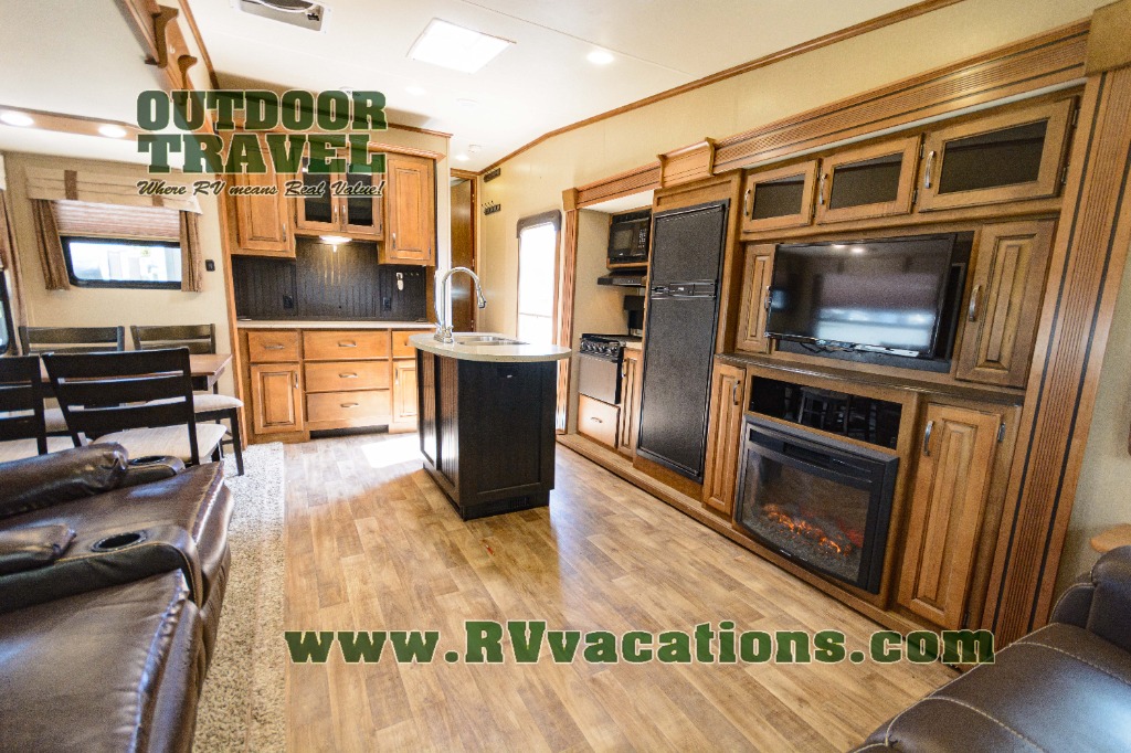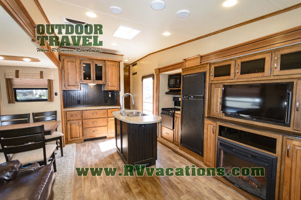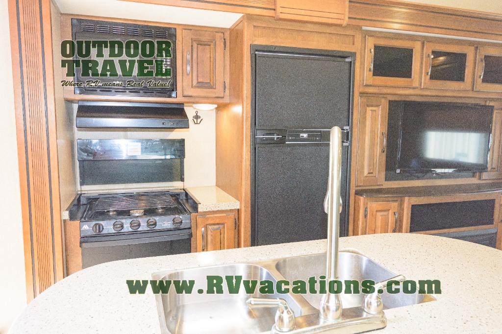 Back down on the main level find a kitchen area with countertop and overhead storage space along the interior living area wall. There is a convenient island with a large sink and counter prep space. The first slide out is along the entrance door wall including a three burner range with microwave above, a refrigerator, and an entertainment center with 32" TV plus a fireplace.