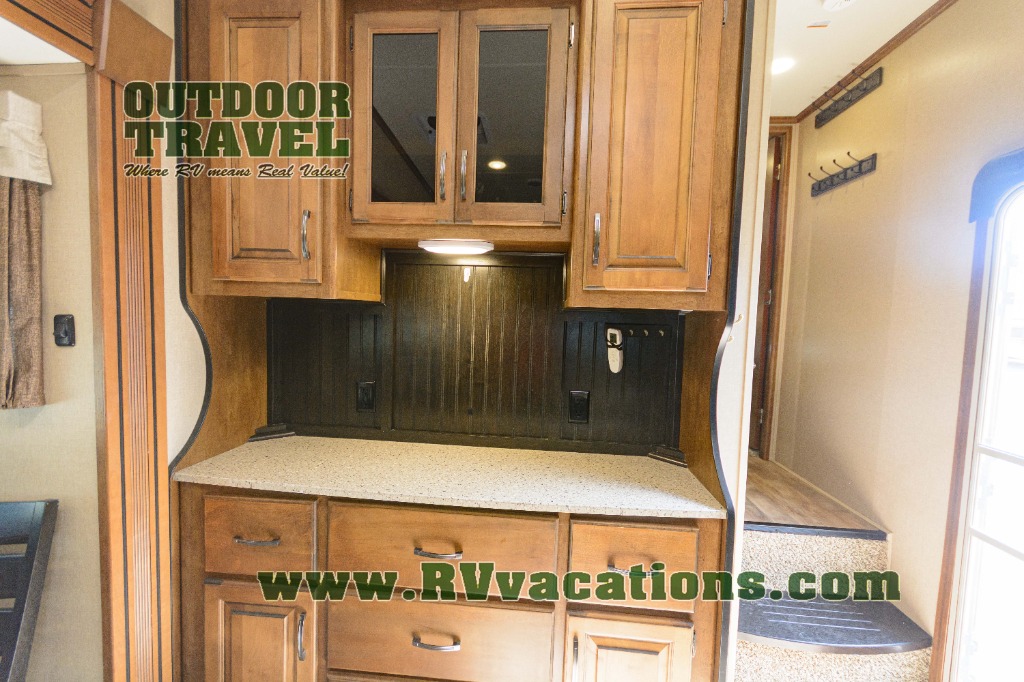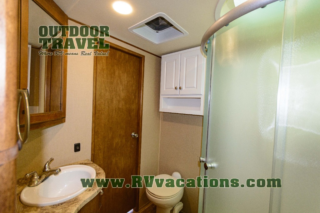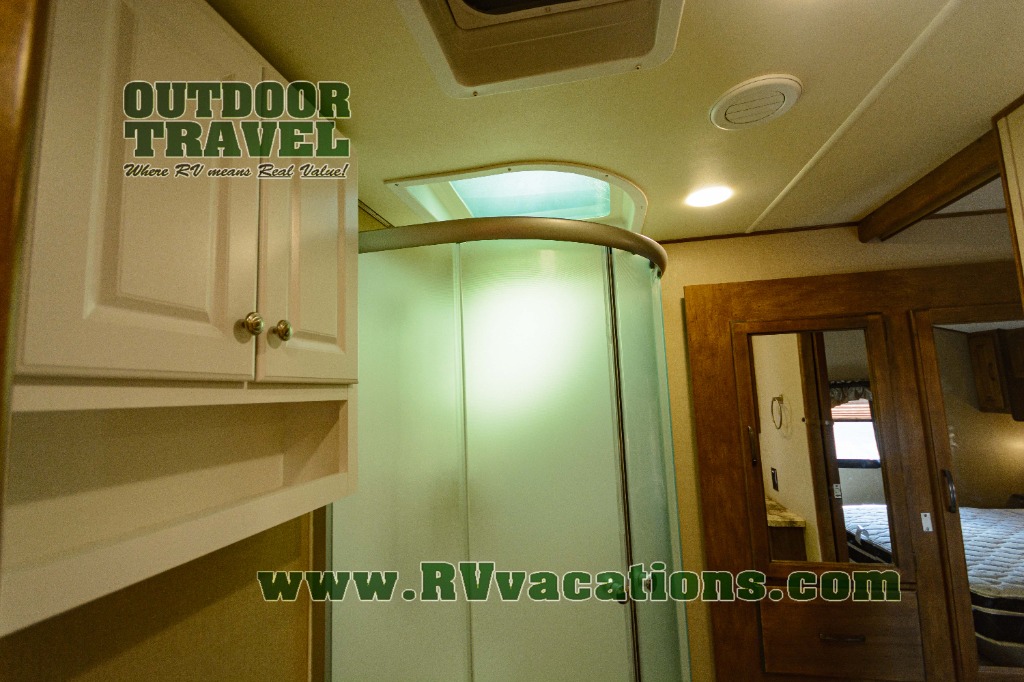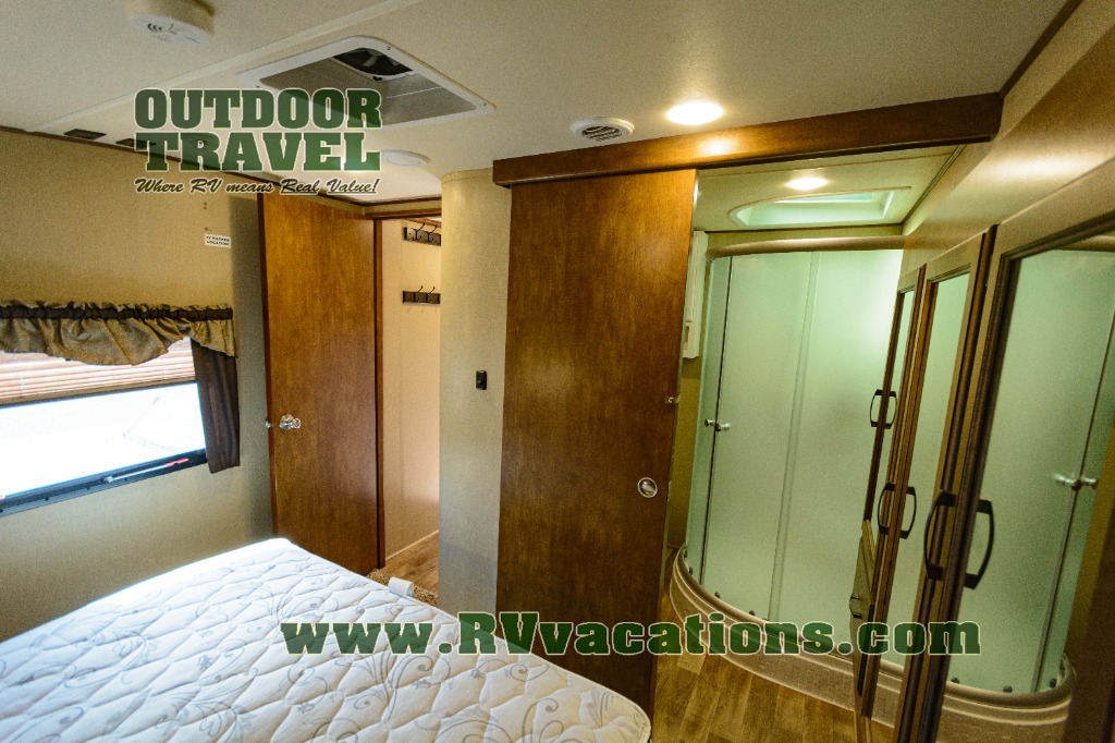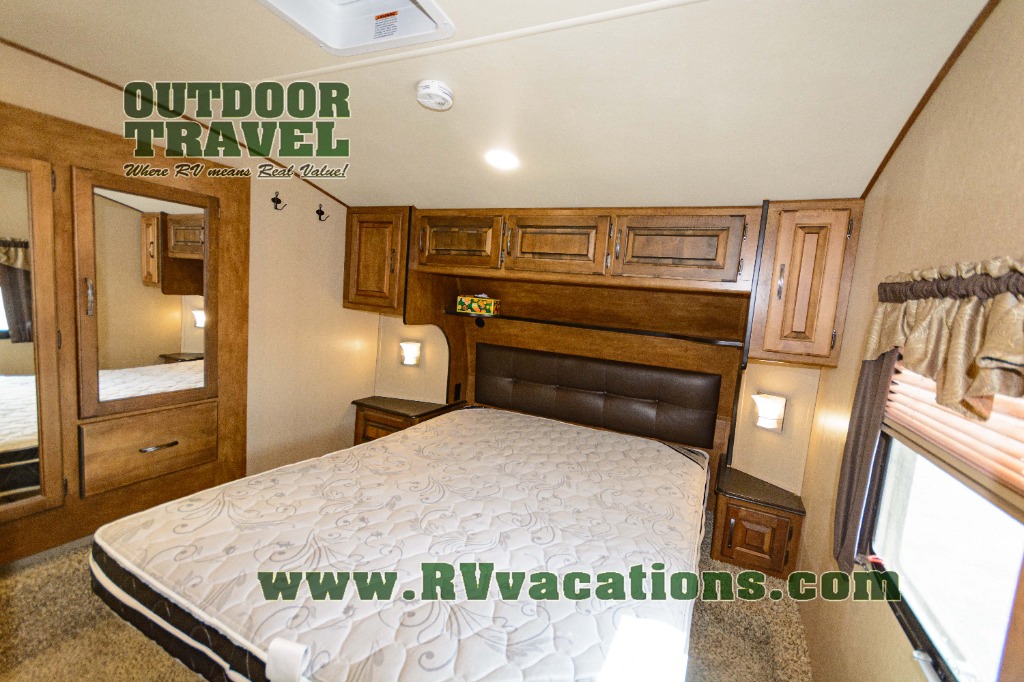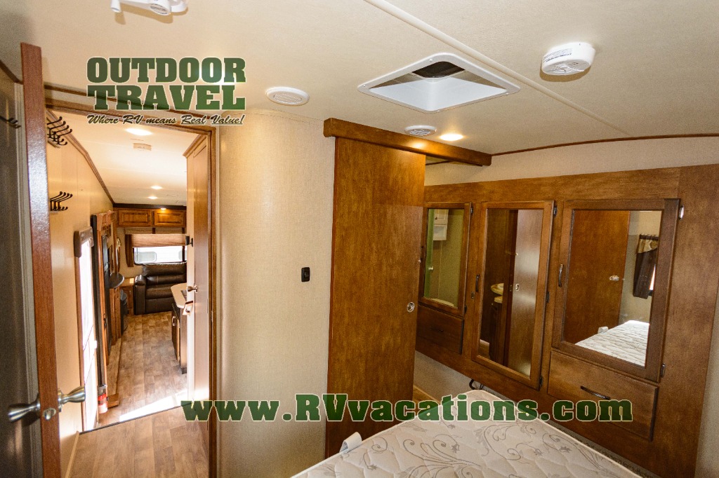 In the bedroom find a queen size bed, overhead cabinets on either side of the bed, plus above the head of the bed as well. There are also slide out wardrobes for your clothing, plus the linen cabinet that is accessible from within the bathroom.