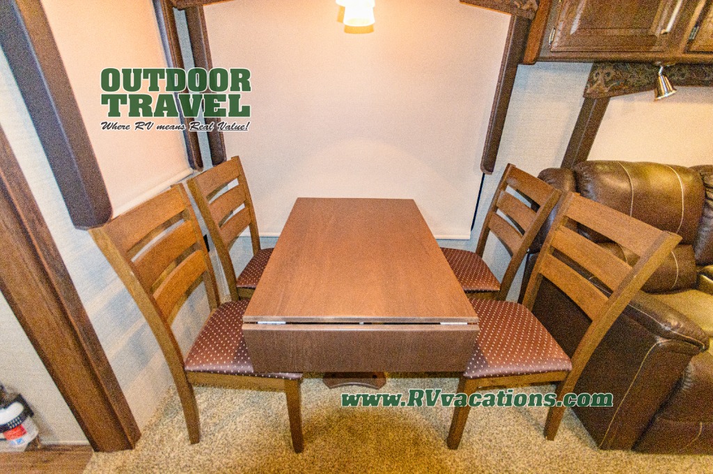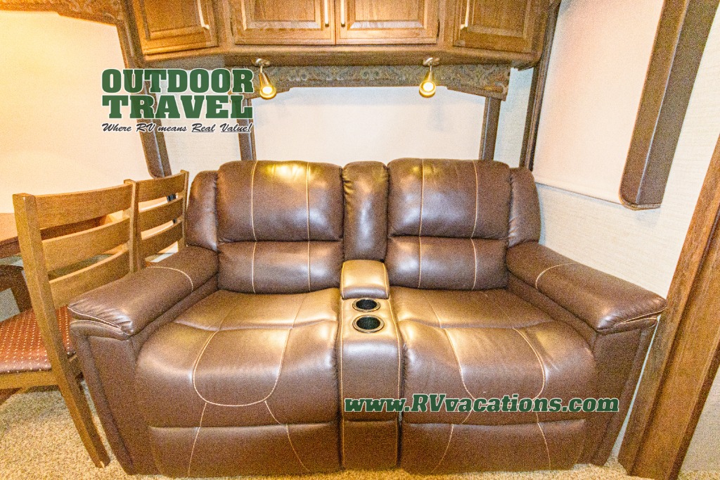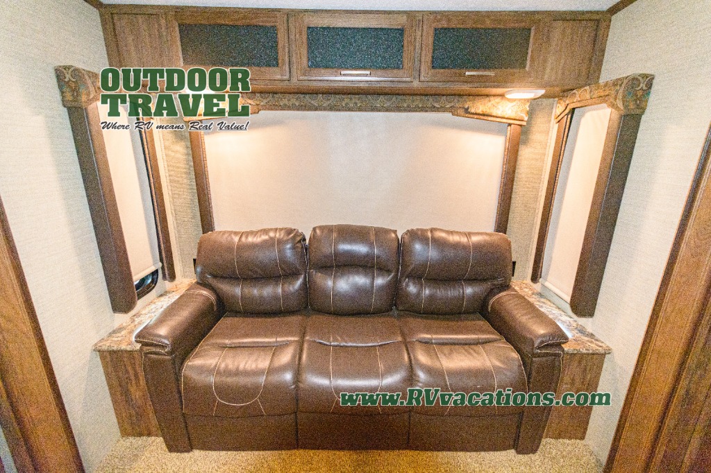 To the left of the door find a slide out free-standing table and theater seats with overhead cabinets. You may choose the optional recliners in place of the theater seats, and an optional booth dinette in place of the table. Along the rear of the unit you will find a tri-fold sleeper sofa with end tables and an overhead cabinet the entire width of the unit.