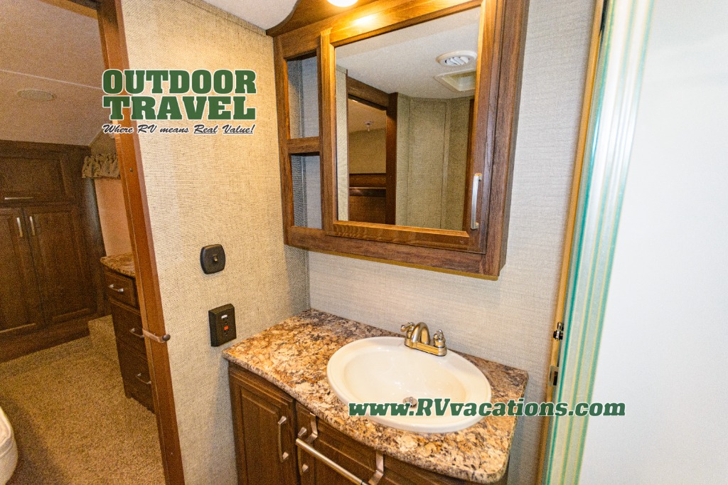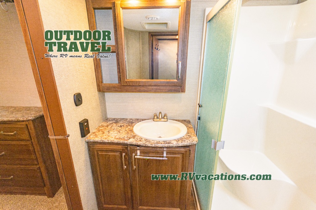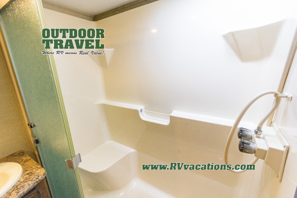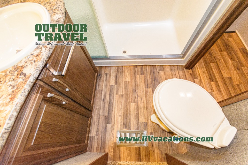 Take the steps up along the curb side wall to a front bedroom and side aisle bath. The bath includes a shower with seat, toilet, and vanity with sink plus overhead storage. A sliding second door in the bath allows you immediate access into the front bedroom.