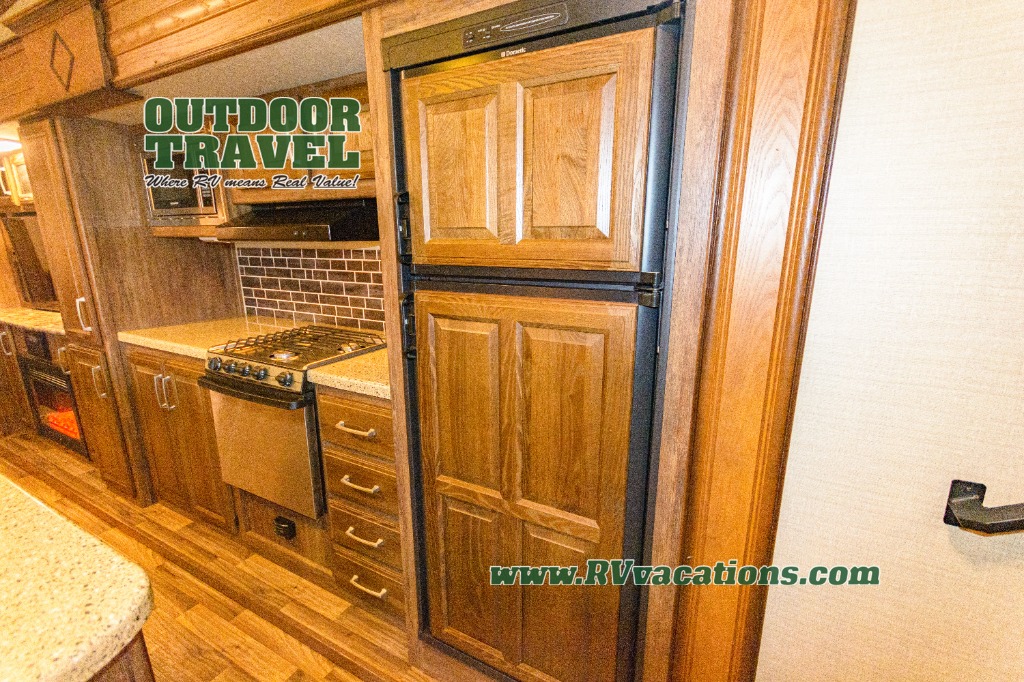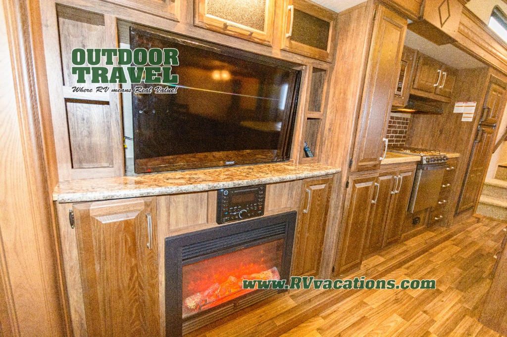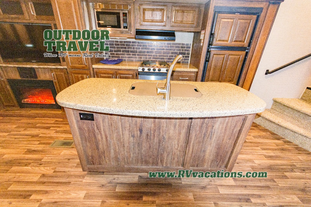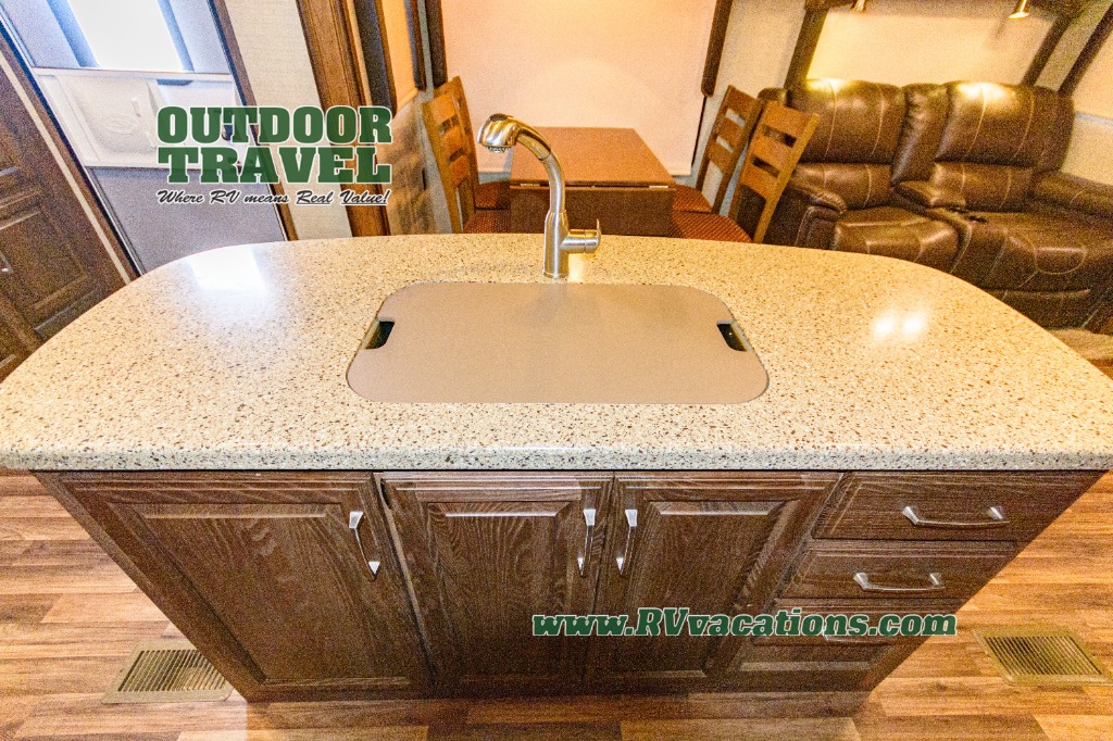The side opposite the door features an entertainment center with a LCD TV. There are also kitchen appliances in this entertainment center slide which includes a pantry, counter space, three burner range, and a refrigerator. The handy island is off center and is the location for the double kitchen sink.
