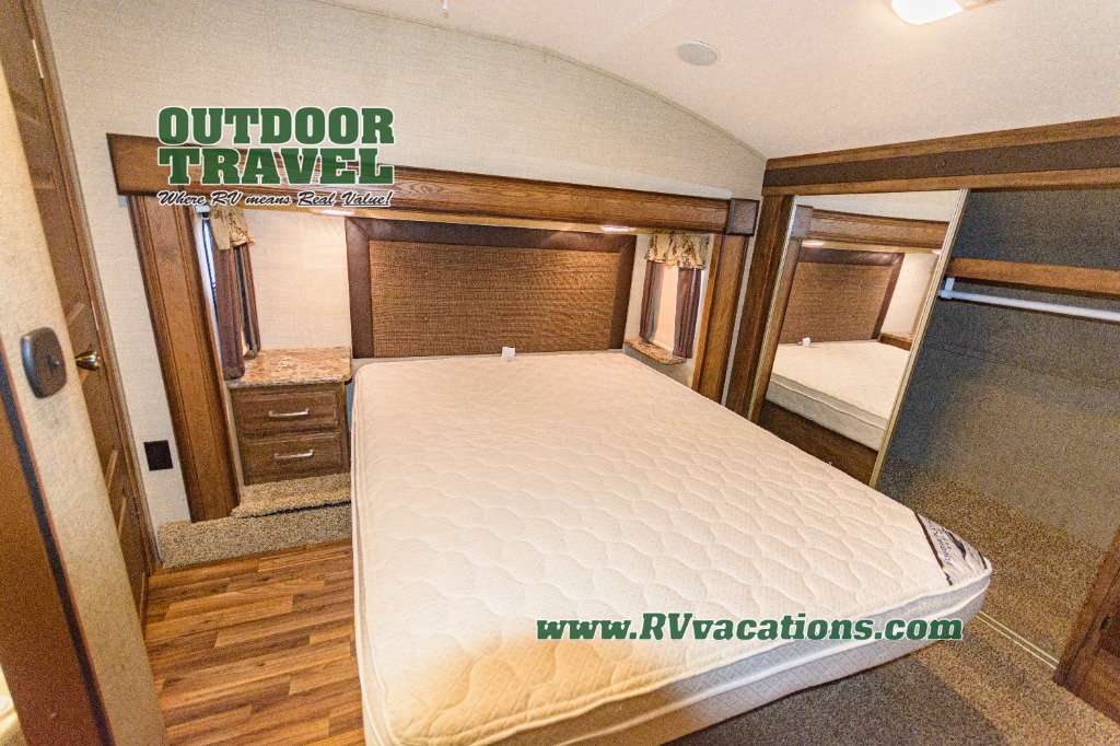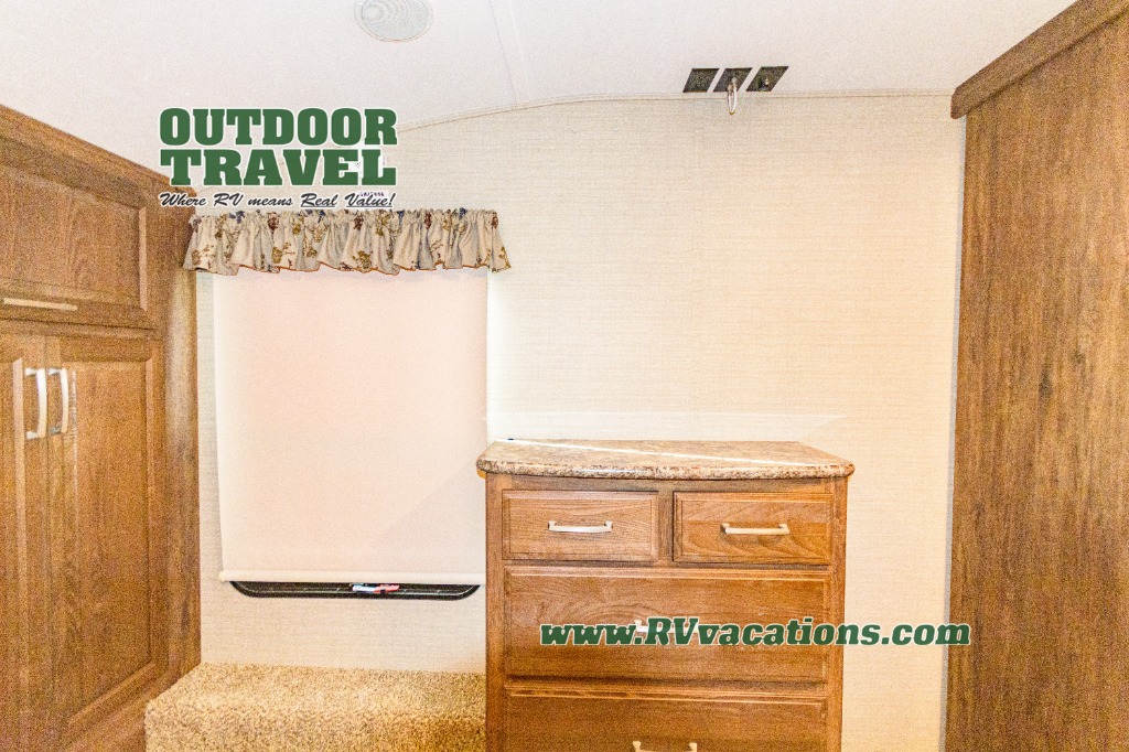 There is also a hall entry door to the front private master suite featuring a queen bed slide with nightstand. A chest of drawers opposite the bed provides plenty of drawer space for all of your things. Along the front wall a full height wardrobe with a sliding door makes room for all of your hanging clothes, plus there is also a nightstand too. A corner wardrobe has been prepped for a washer and dryer for added convenience if you choose to add, and so much more!