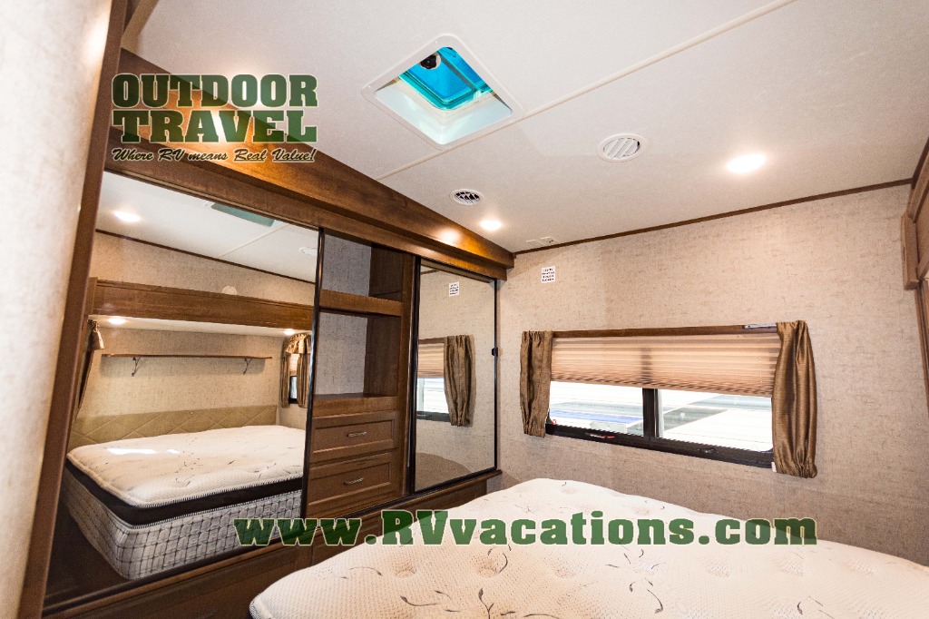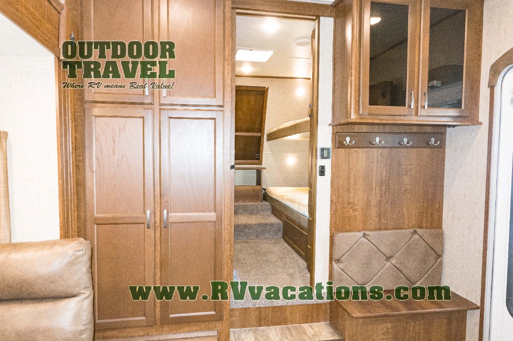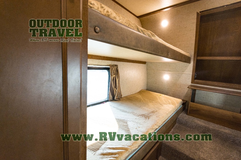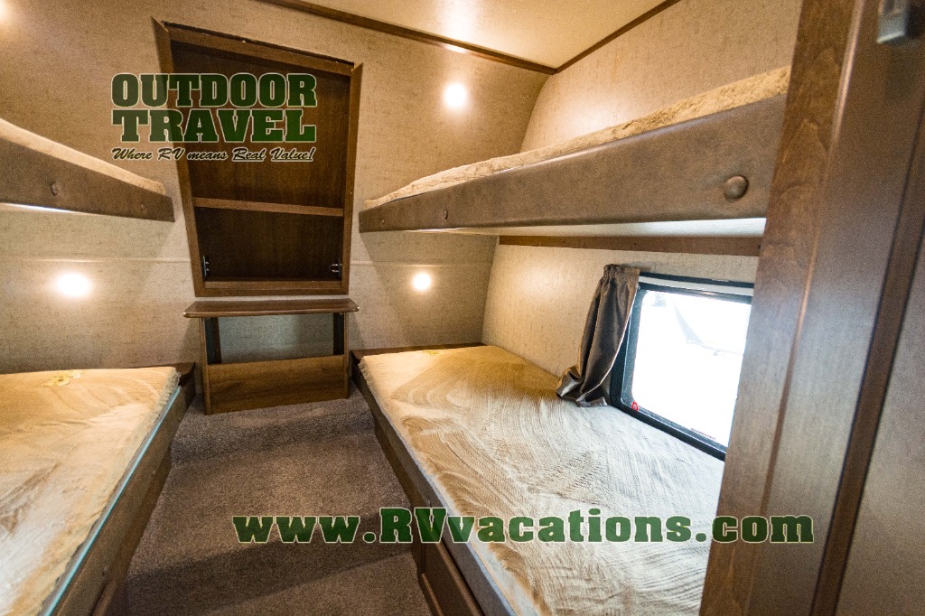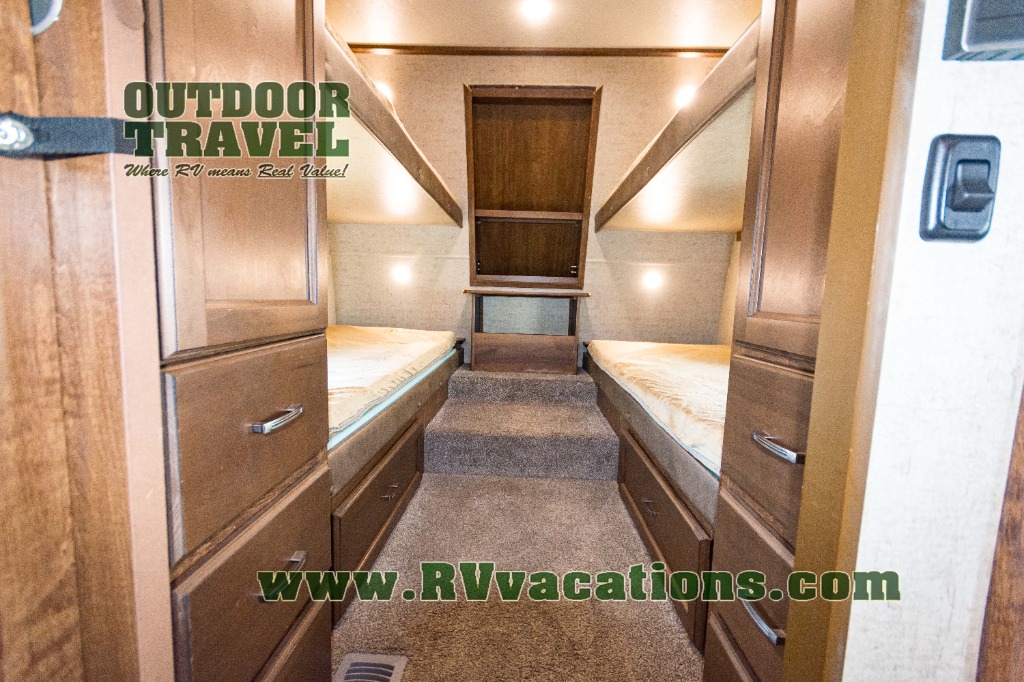 In the front of the fifth wheel you will find a private bunkhouse with two sets of bunk beds allowing for sleeping space for four, cabinets and drawers on each side, and a location for an optional TV up front, plus so much more inside and outside!