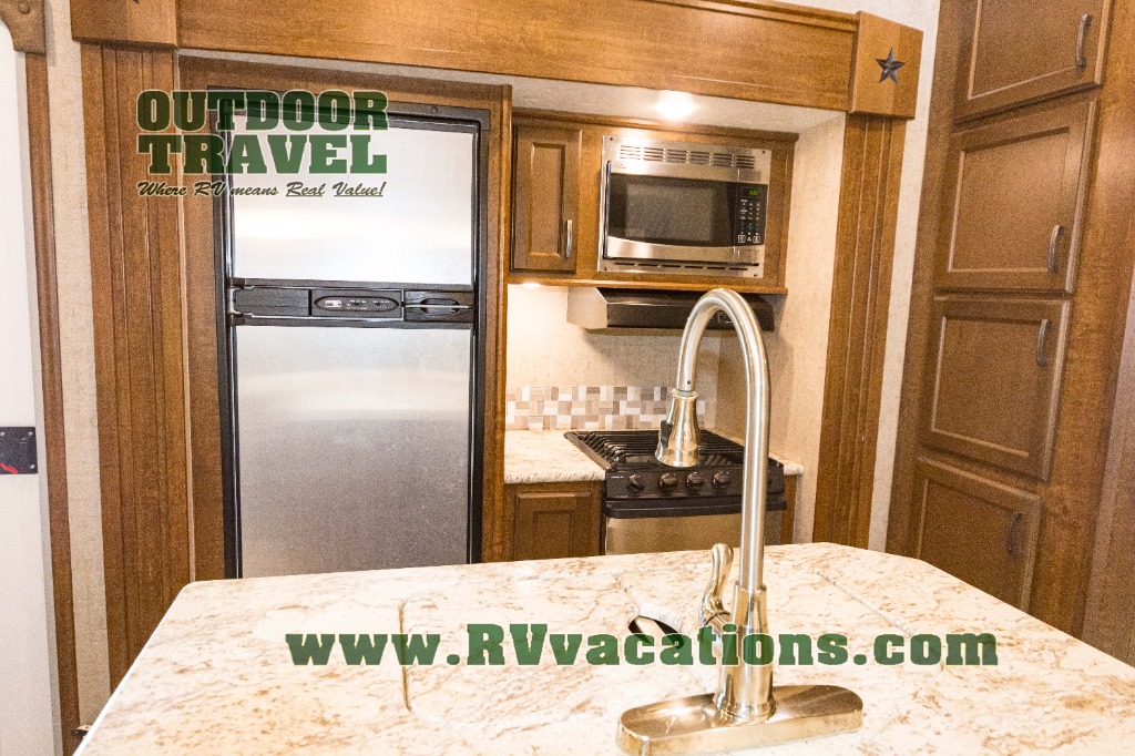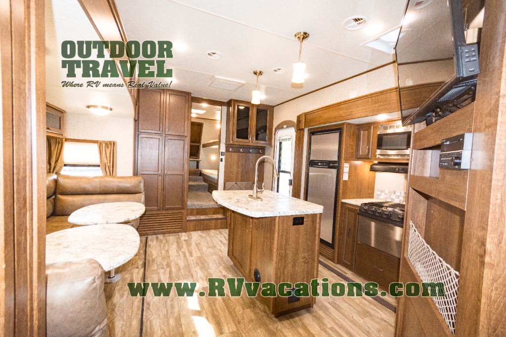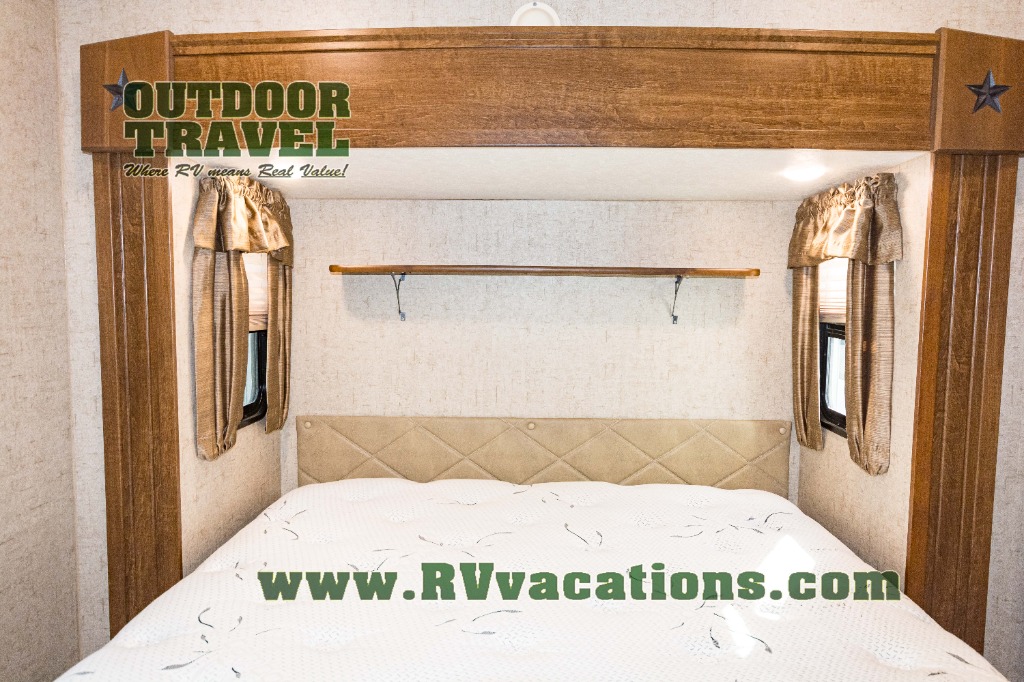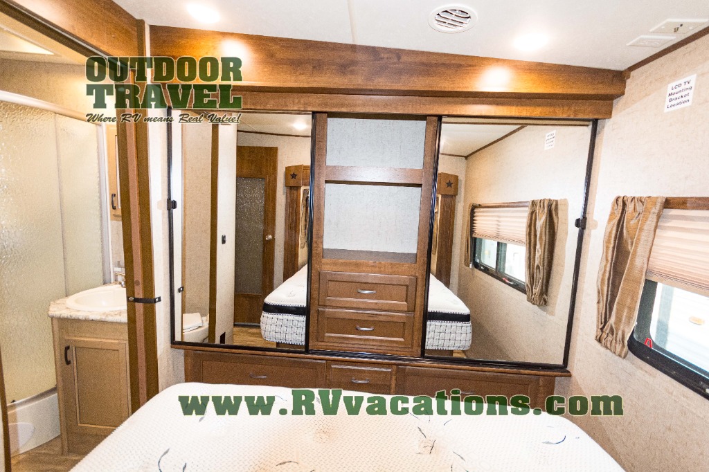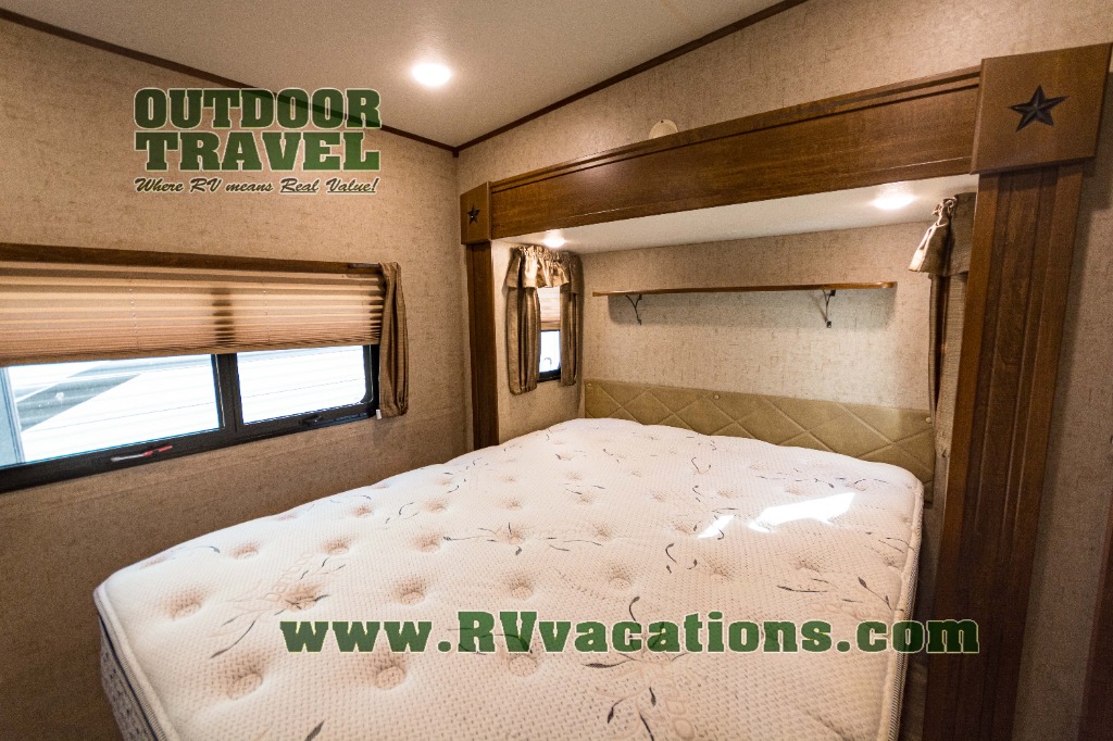 In the front of the fifth wheel you will find a private bunkhouse with two sets of bunk beds allowing for sleeping space for four, cabinets and drawers on each side, and a location for an optional TV up front, plus so much more inside and outside!