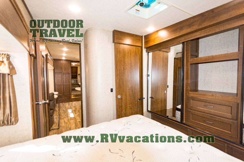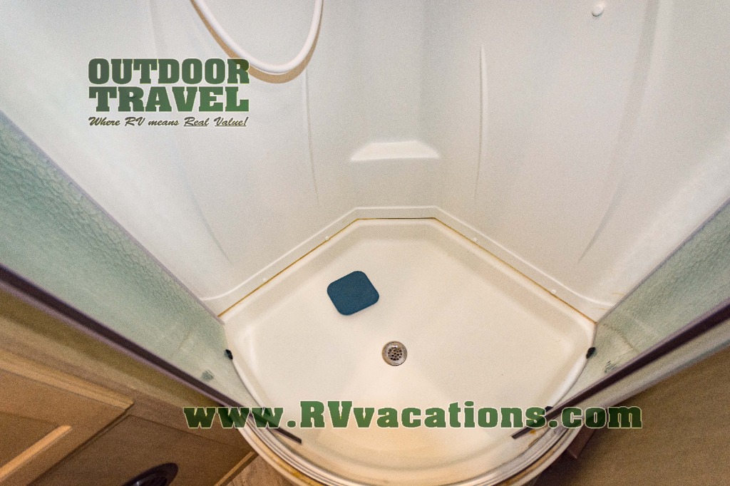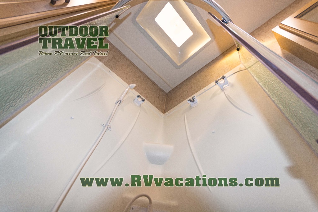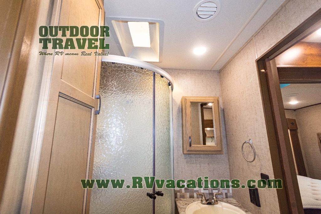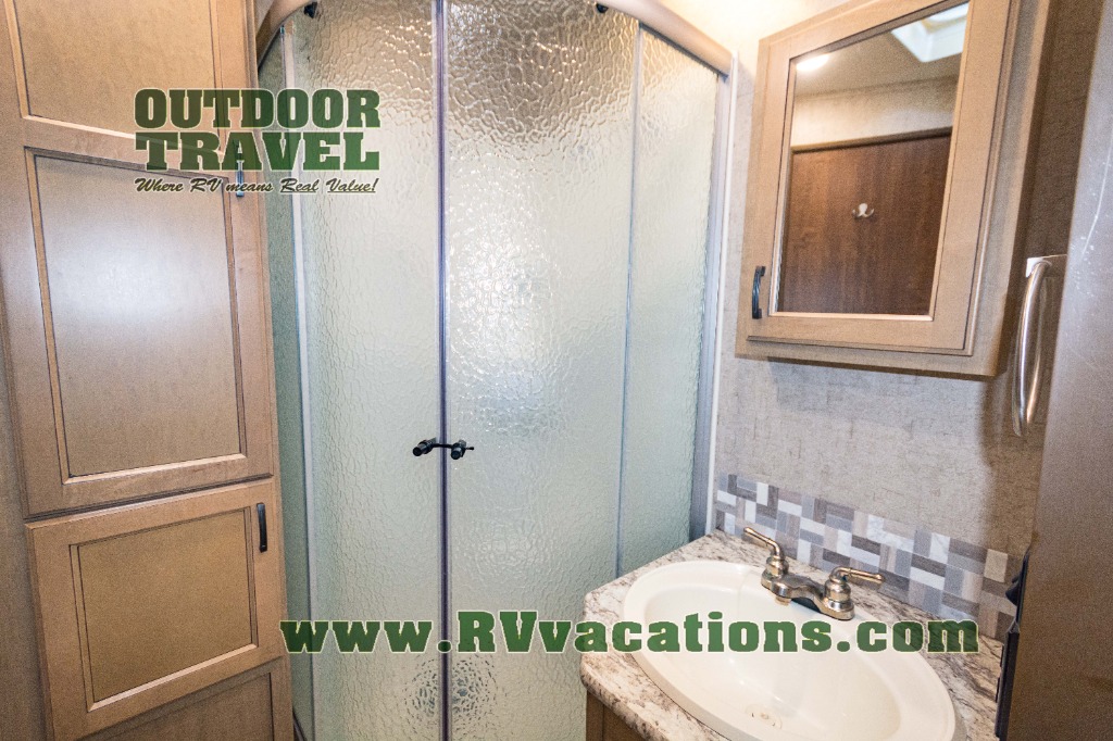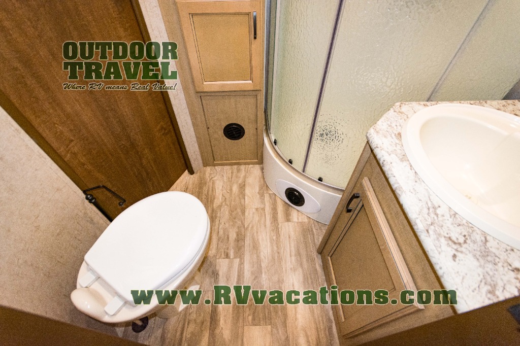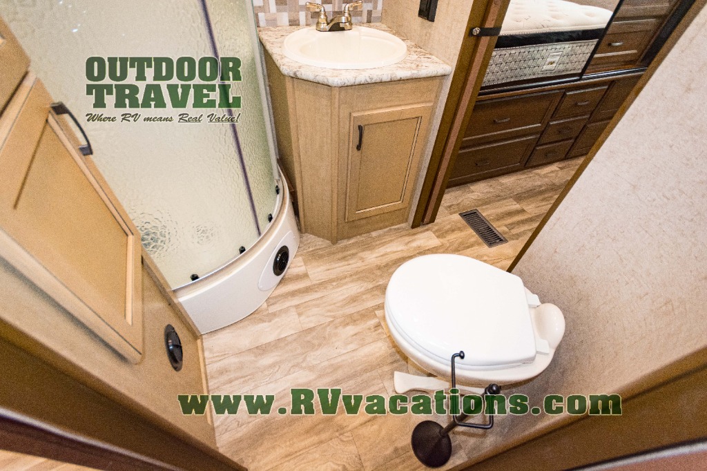 The complete bath features a toilet, sink, linen cabinet, and radius shower. There is also a second entry door that leads directly into the rear master bedroom where you will find a wardrobe with storage drawers below, and a queen bed slide.