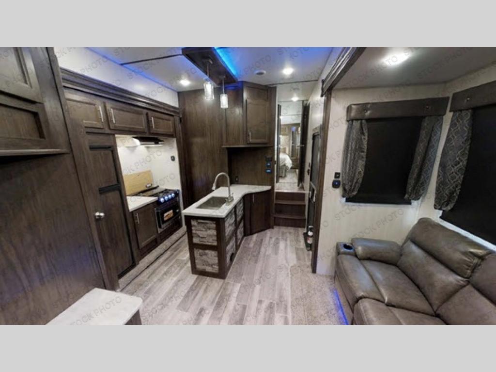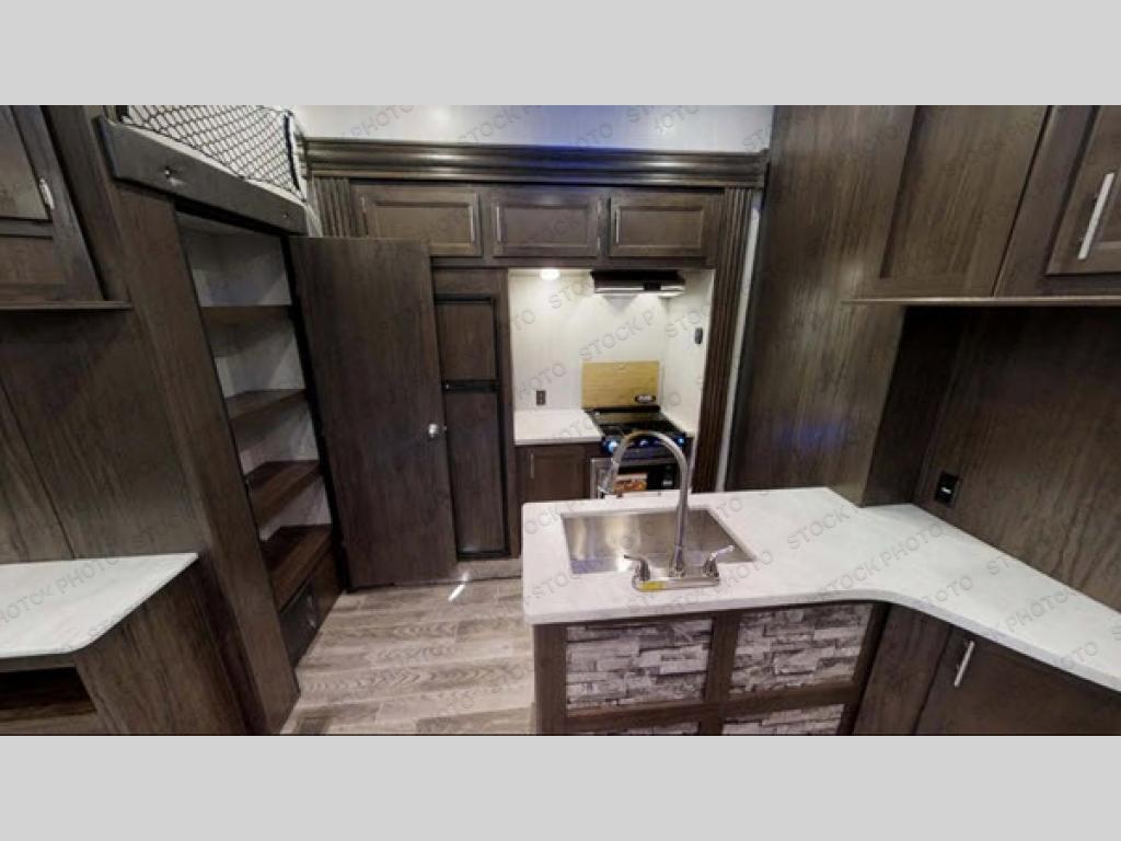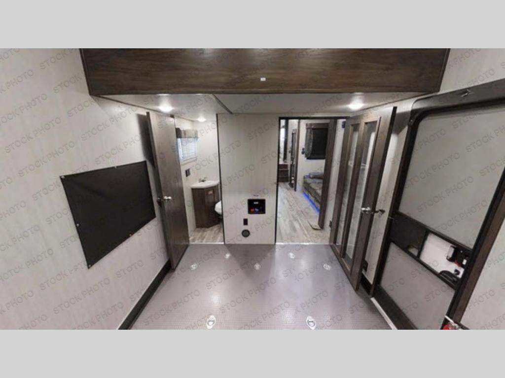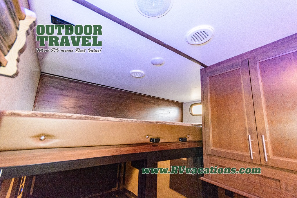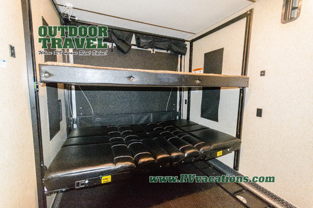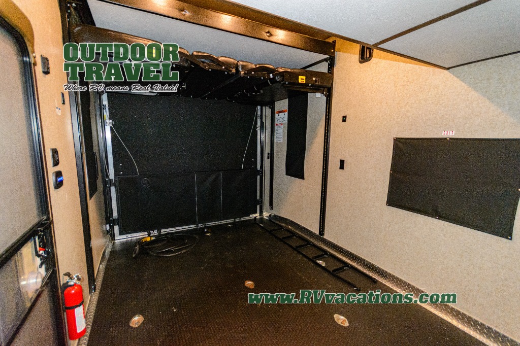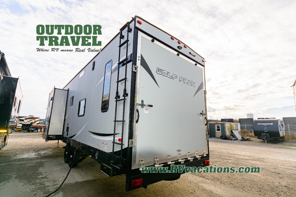 Come see just how fun and easy any camping trip can be with this double-slide Cherokee Wolf Pack toy hauler. With the 13' of cargo space, you can bring along lots of toys and camping equipment, and after your gear is unloaded, you can set up the sofa beds. Above the sofas is a Happijac power bunk which offers sleeping space for two. Off of the cargo area there is a convenient half bathroom where you can clean up before coming into the main living area. Overlooking the kitchen and living area is the loft with a queen bed. At night you can retreat to the private master suite which features a queen bed with storage below.