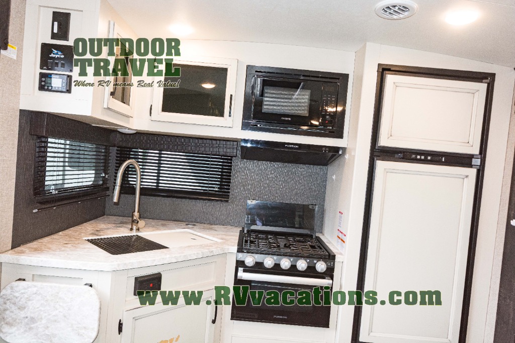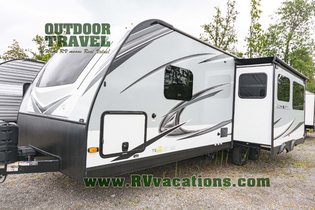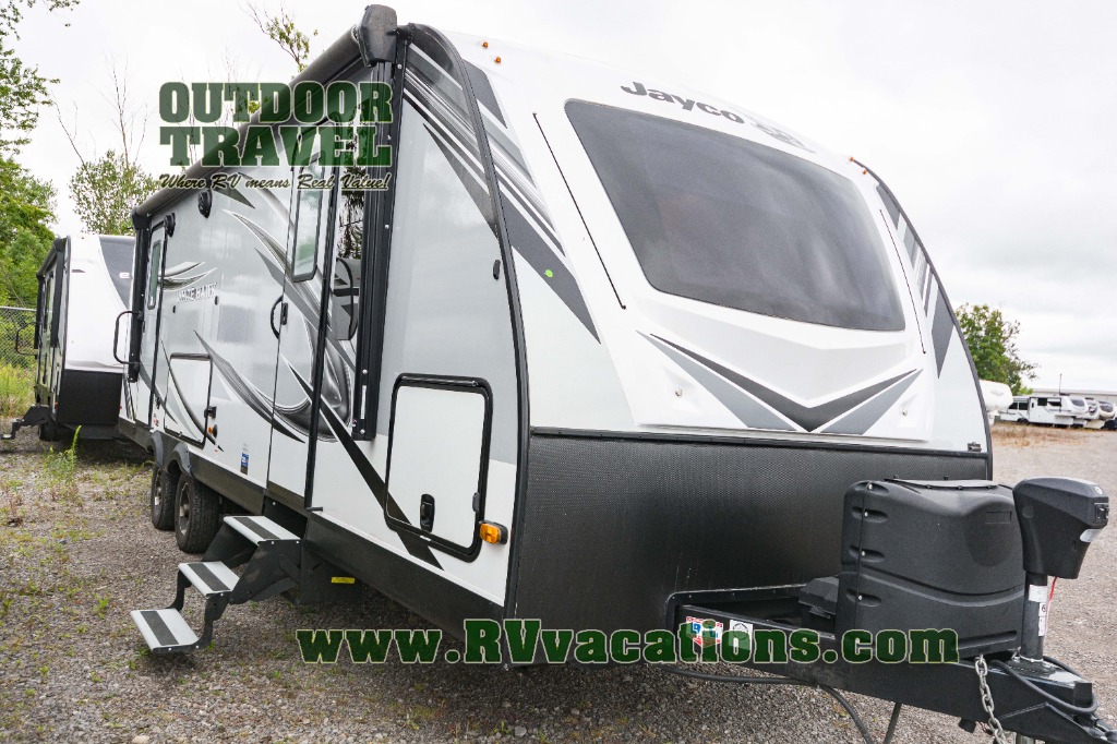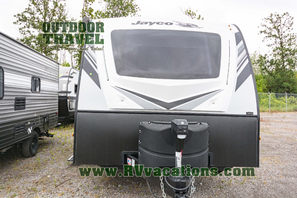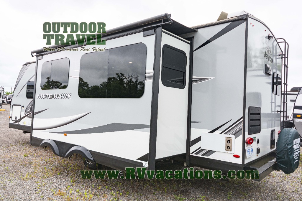 If you're wanting a lightweight travel trailer packed with convenience and luxury then look no further than these Jayco White Hawk travel trailers! Jayco uses the top-quality materials and innovative manufacturing techniques to create the superior StrongholdVBL vacuum-bond lamination, and the Magnum Truss Roof System for a 50% stronger roof than any other in the industry. The screwed construction creates a more firmly secured structure and the 2" x 2" vertical studs provide smoother edges for safer wiring to reduce the risk of electrical shorts. Each model comes with two mandatory packages to include extra luxurious features like the Furrion range, the kitchen skylight, and the outside shower. You will also enjoy the Climate Shield zero-degree tested weather protection, the JAYCOMMAND "Smart RV" system, and the MORryde StepAbove entry steps, plus there is even a roof-mount solar prep. The American-made Goodyear tires and Dexter axles with self adjusting brakes and galvanized steel wheel wells ensure you will arrive safely to each destination. Come explore these lightweight travel trailers today!