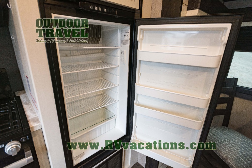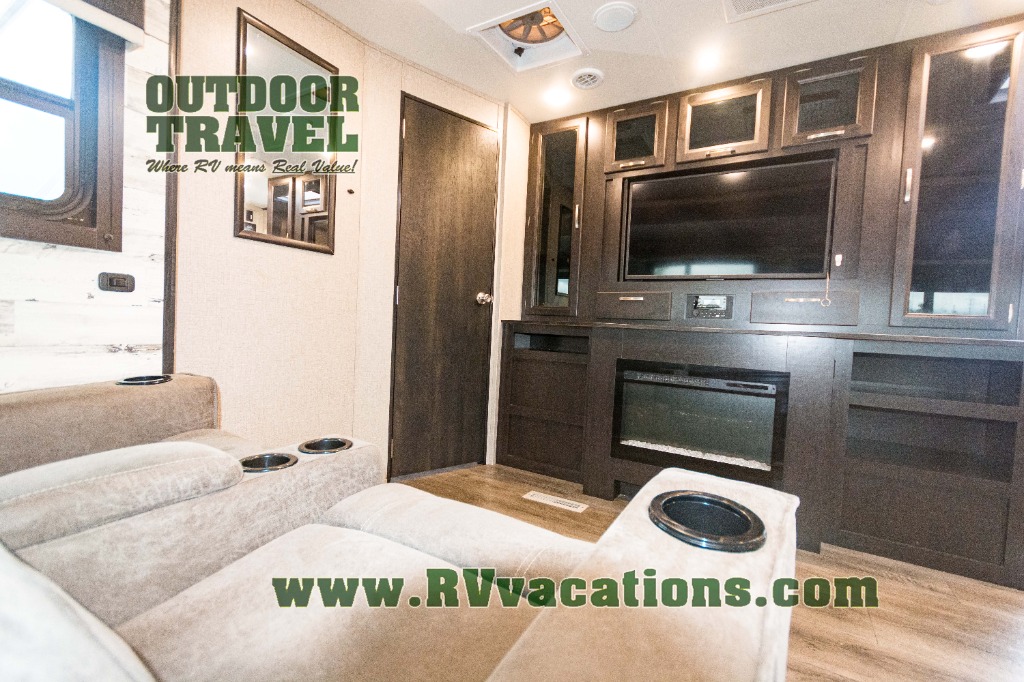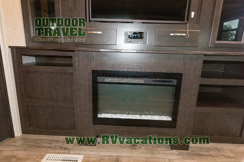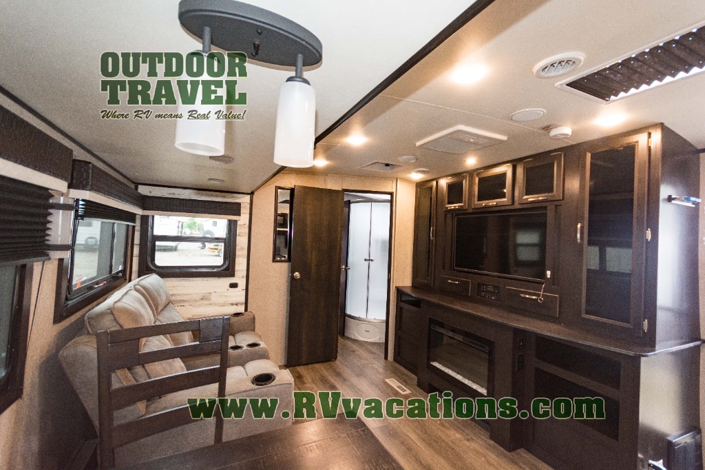 You will feel right at home in this travel trailer! The rear kitchen layout allows you to move about freely while you created a delicious meal with the three burner Furrion glass cooktop, the 8 cu. ft. refrigerator, and even the microwave. You can enjoy each meal comfortably at the booth dinette then play a card game or you can relax on the tri-fold sofa and enjoy the entertainment center with the electric fireplace and the 40" LED TV. You can start your days feeling clean and fresh by taking a hot, steamy shower in the glass 34" radius shower inside the walk-through bathroom, plus there is a linen closet and a small wardrobe for your storage needs. The front private bedroom offers a queen bed for a good night's rest with wardrobes on either side to keep your clothes neat, and even an entrance/exit door for you to slip out early in the morning for a quick fishing trip!