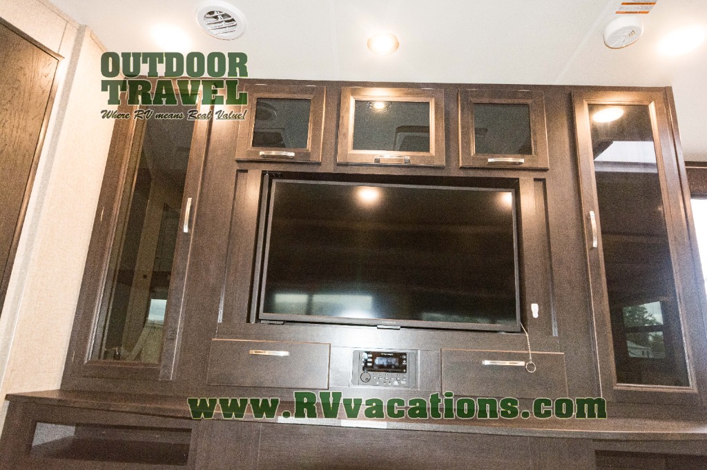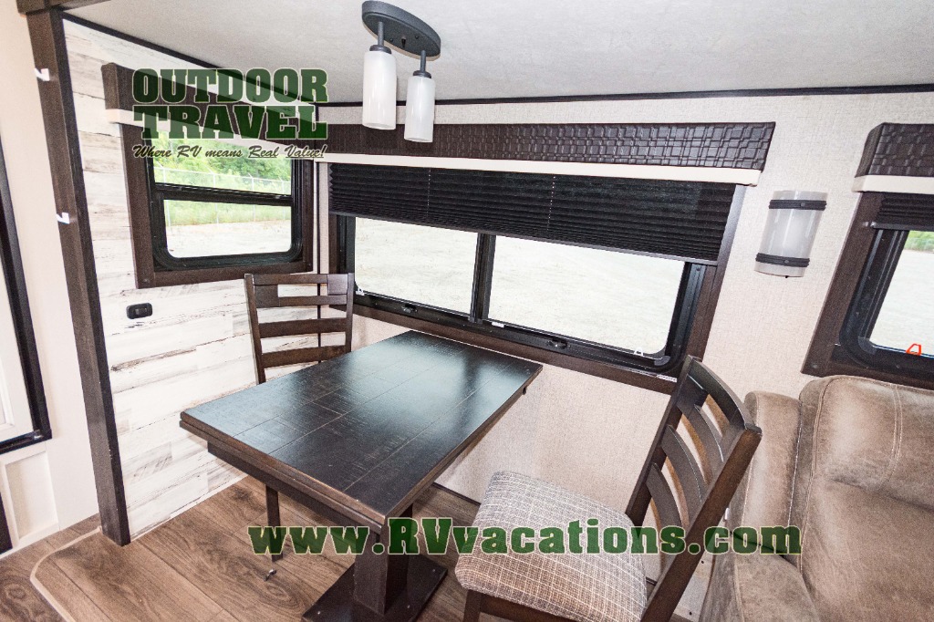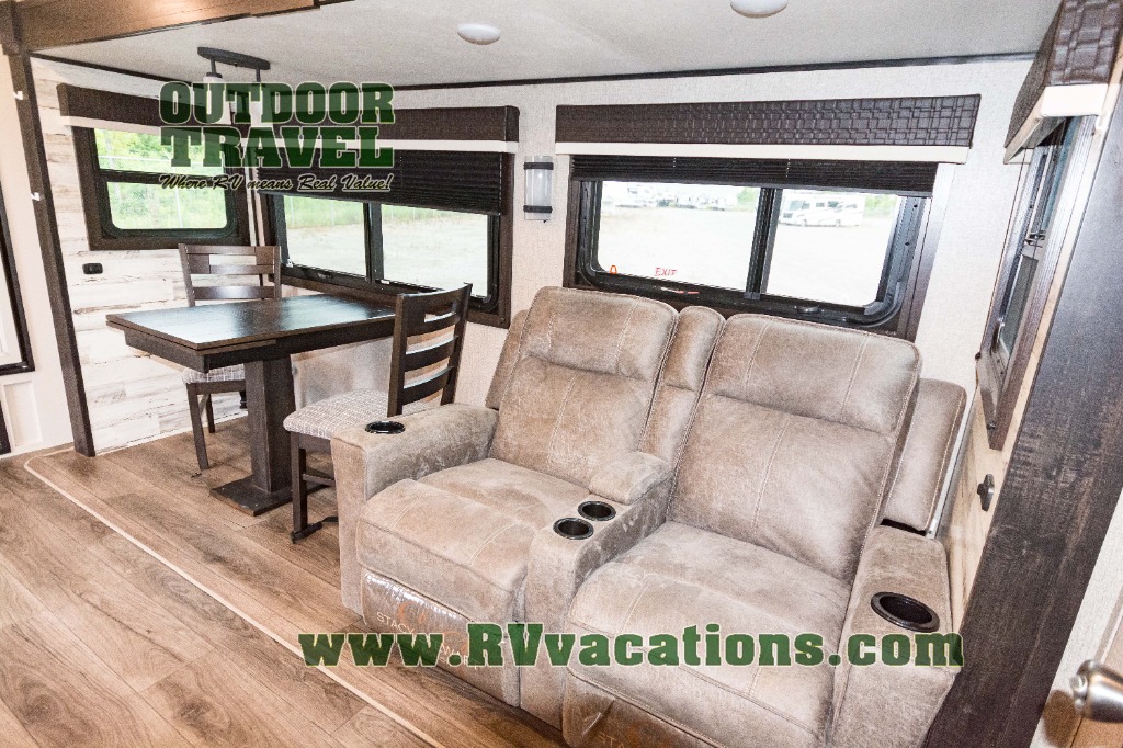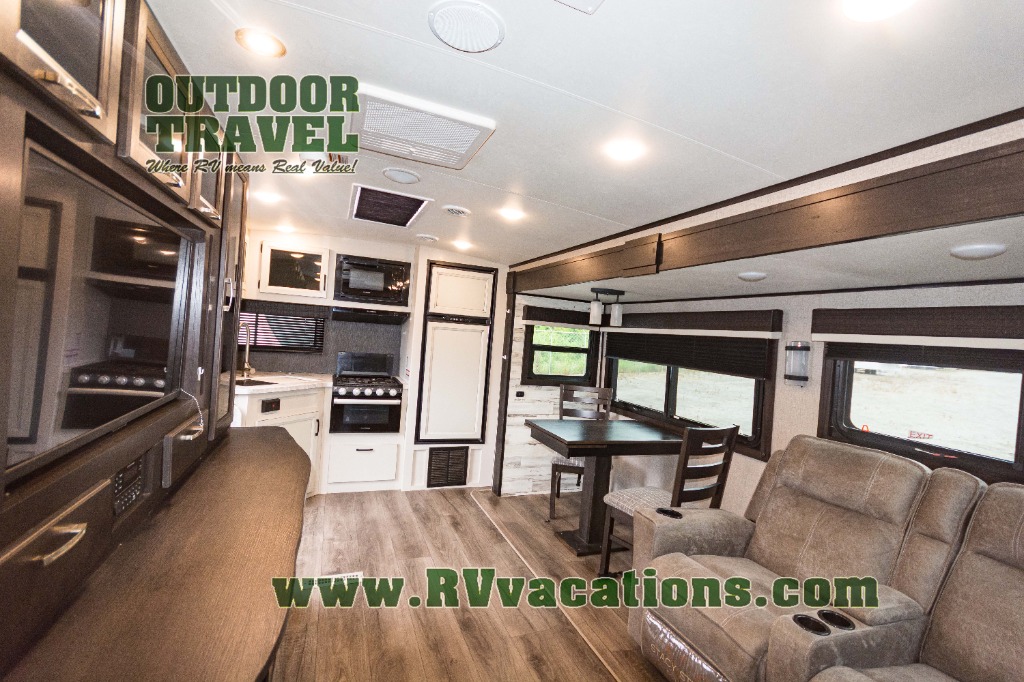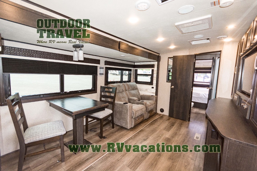 You will feel right at home in this travel trailer! The rear kitchen layout allows you to move about freely while you created a delicious meal with the three burner Furrion glass cooktop, the 8 cu. ft. refrigerator, and even the microwave. You can enjoy each meal comfortably at the booth dinette then play a card game or you can relax on the tri-fold sofa and enjoy the entertainment center with the electric fireplace and the 40" LED TV. You can start your days feeling clean and fresh by taking a hot, steamy shower in the glass 34" radius shower inside the walk-through bathroom, plus there is a linen closet and a small wardrobe for your storage needs. The front private bedroom offers a queen bed for a good night's rest with wardrobes on either side to keep your clothes neat, and even an entrance/exit door for you to slip out early in the morning for a quick fishing trip!