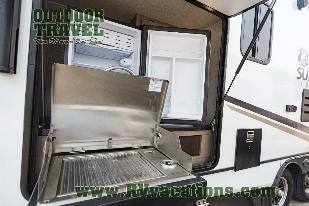 With any Sunset Trail travel trailer by CrossRoads RV, the interior offers a stainless steel farmhouse single bowl sink with a cover, solid surface countertops in the kitchen, a 12 volt refrigerator, USB ports in the bedroom and main area, and a Connexx entertainment TV with soundbar for inside enjoyment. Also included is the Extreme Weather package with maximum insulation with reflective foil, a 30,000 BTU furnace, and a 2" heat duct in the enclosed underbelly for four seasons of traveling. And the Blade Air system offers 20% more airflow and re-engineered components on the A/C. The HyperDeck flooring is water resistant, fiberglass reinforced and has polypropylene layers. Make your lightweight and comfortable RV decision today!