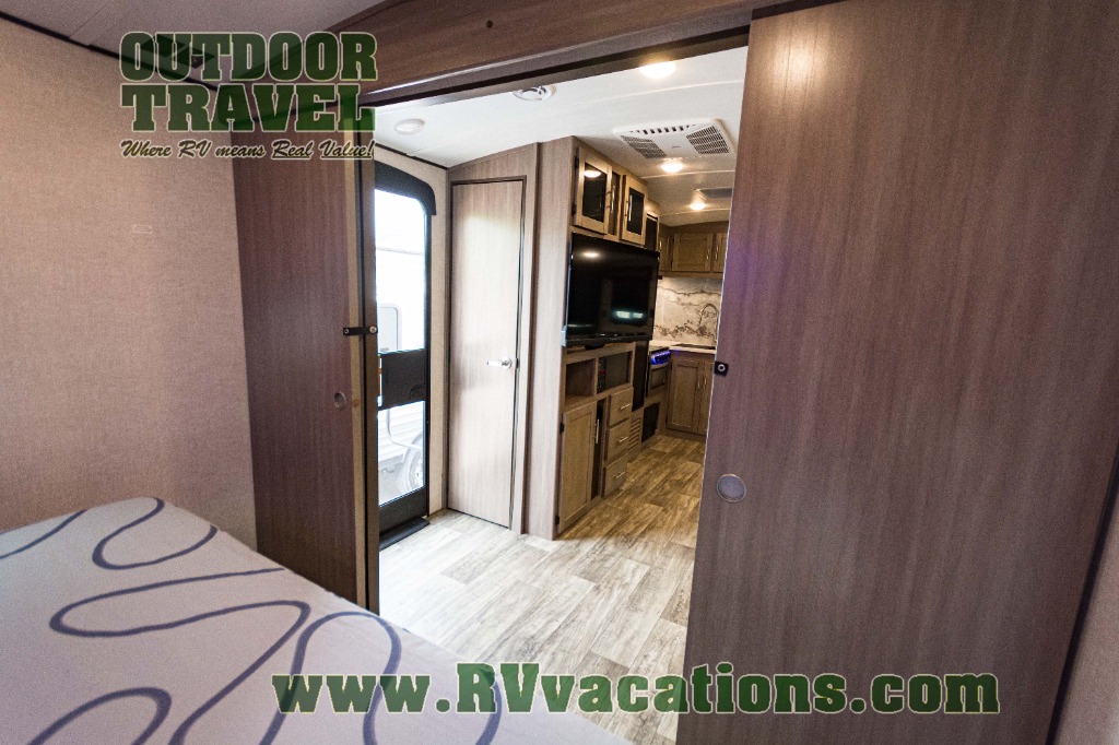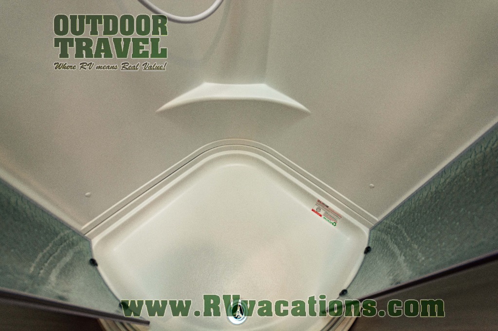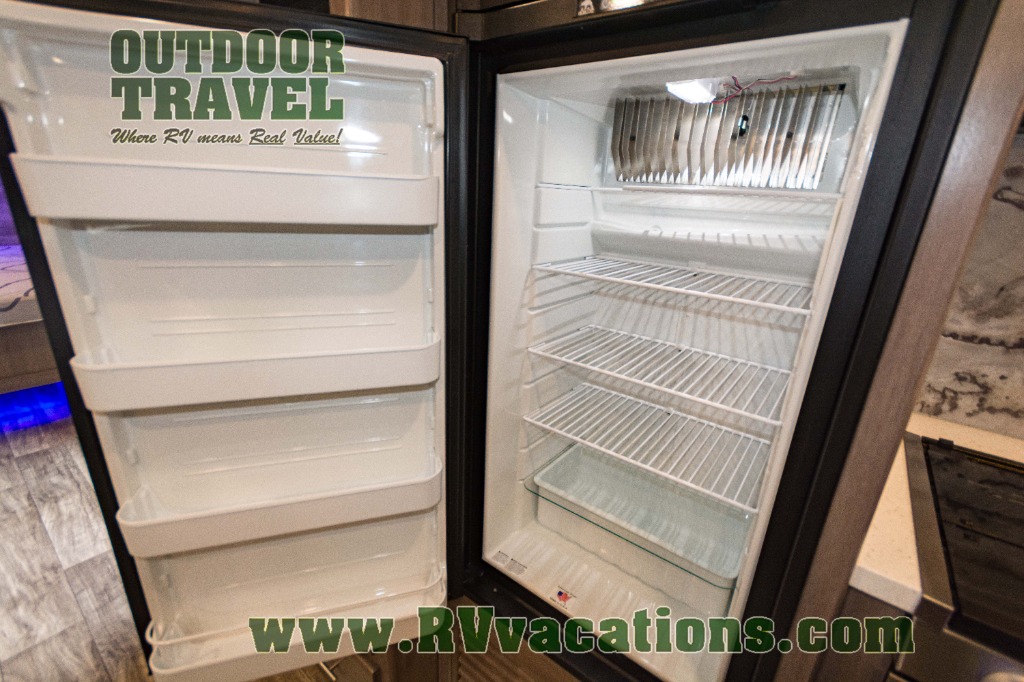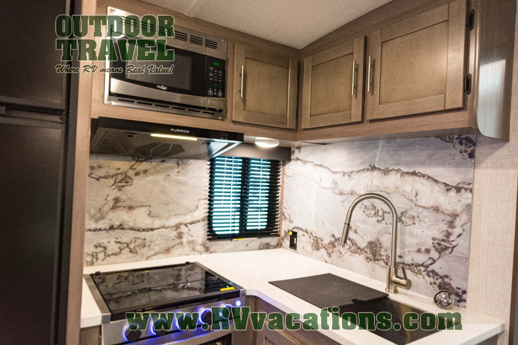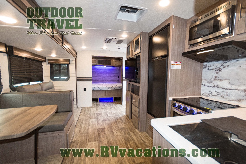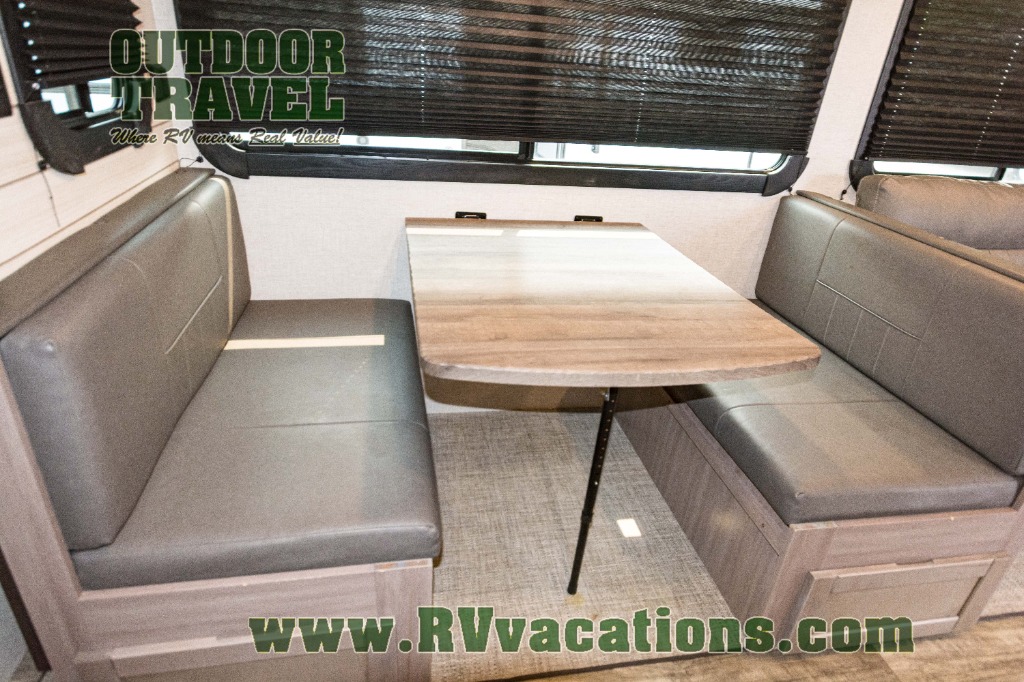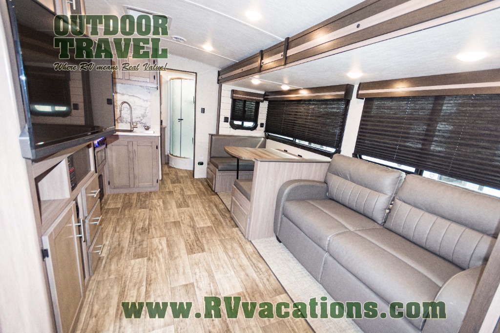 You will love the added interior space you have in this travel trailer thanks to the large slide out in the main living area. Here, you'll enjoy playing cards at the XL booth dinette and relaxing on the tri-fold sofa. Make home-cooked meals on the glass top range or use the exterior camp kitchen. There is even an exterior refrigerator for cold drinks, and the power awning will shade you from the hot summer sun. This model features a full rear bath for added privacy, and the shower skylight will allow natural light in. The front private bedroom includes a king bed, dual wardrobes, plus a shoe storage and pet station for your convenience!