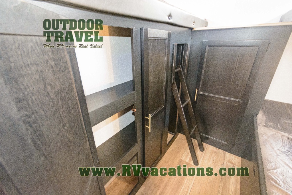 Your larger family will love spending weekends away with this Cherokee Grey Wolf travel trailer as their home away from home. This model offers lots of sleeping space with three bunk beds in the rear private bunkhouse. In the front, there is a master suite with wardrobes and nightstands on either side of the queen bed, and it even has private access to the dual-entry bath. The two entry doors will make accessing the trailer easy for everyone, and you will appreciate the abundant storage throughout this unit including large overhead cabinets, a walk-in pantry, and numerous outside storage compartments for all of your outdoor gear. You also even have an outdoor kitchen!