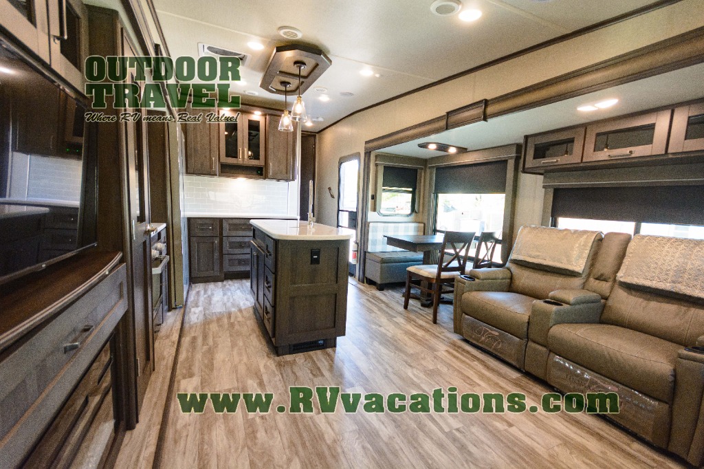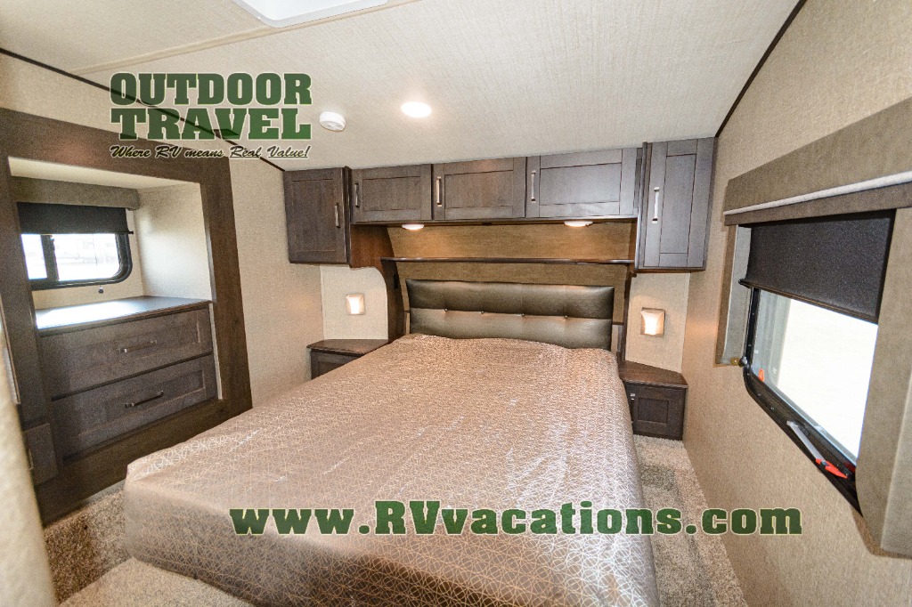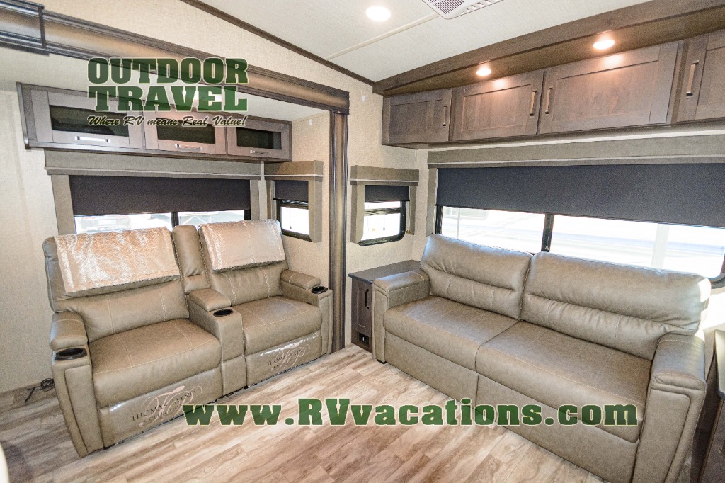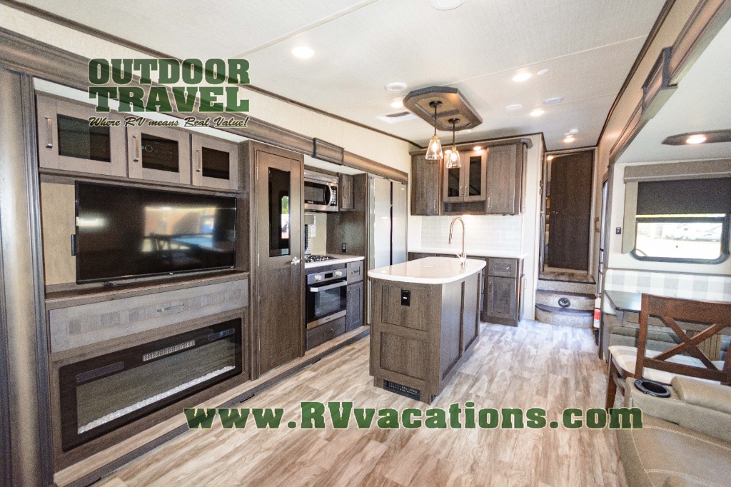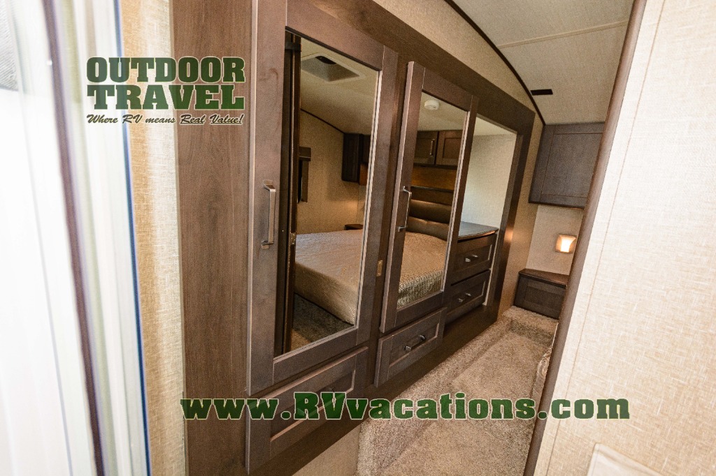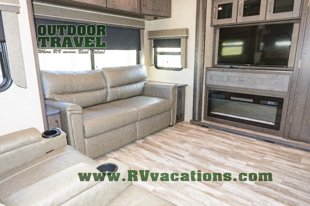 Whether you travel for pleasure or work, you will love the spacious main living and kitchen area with a rear tri-fold sofa that doubles as extra sleeping space, and the theatre seating directly across from the entertainment center with a 40" LED HDTV and a fireplace below. The kitchen island will make meal prepping and drying the dishes easier and the hutch is the perfect place to place your picture frames, nice dishes, and extra cooking items, plus the pantry is big enough to store all of your favorite snacks, dry ingredients and such. Outside you can enjoy two electric awnings that provide protection from the elements as you relax and visit with other RVers, and your camping chairs can easily be stored in the pass-through compartment. The double entry bathroom is convenient especially at night when you can slide the door to enter from the front master bedroom. You will find plenty of storage for your clothing and things, plus the bedroom slide out gives you drawers and linen storage that stretches into the full bathroom.