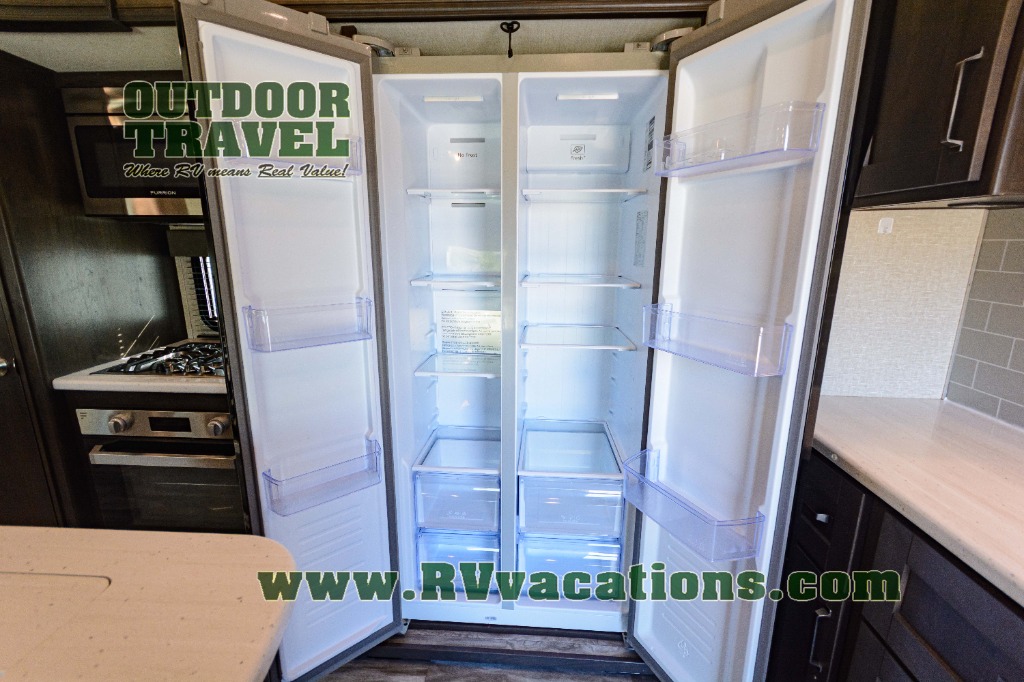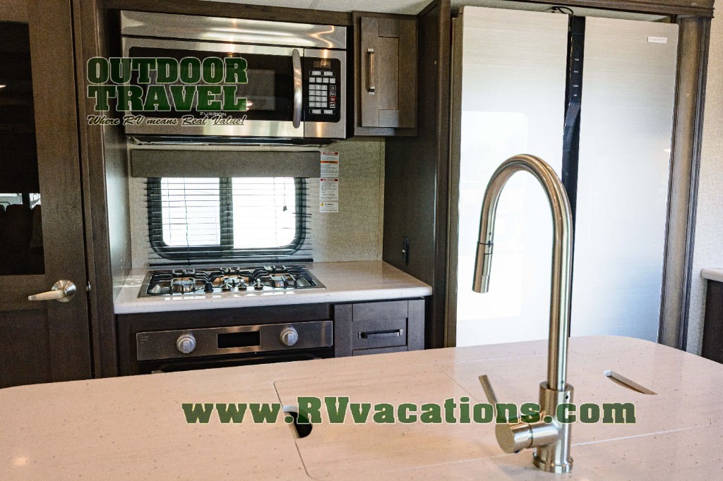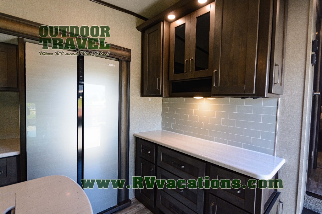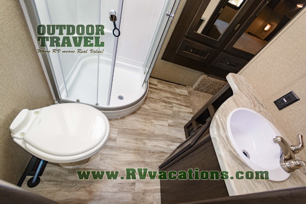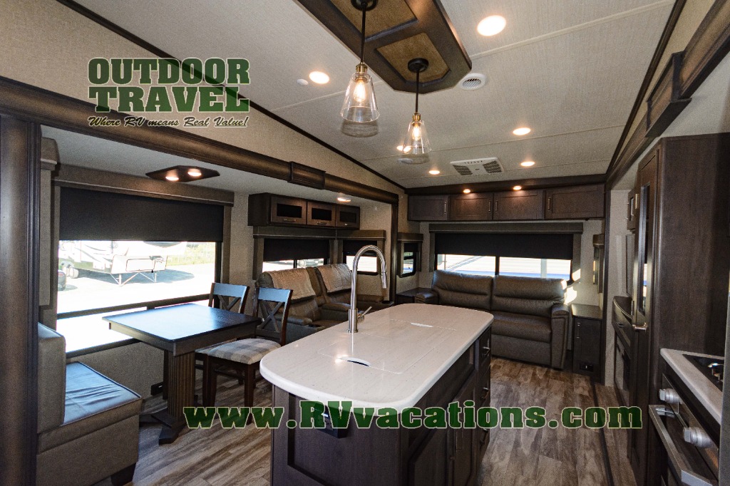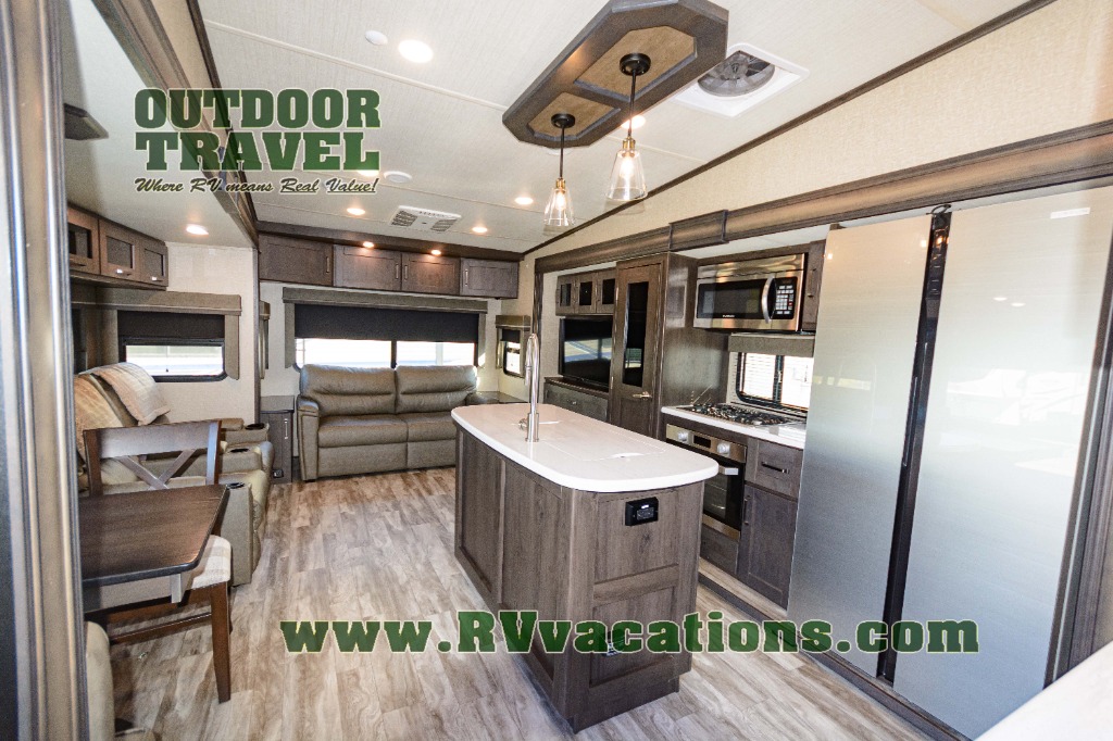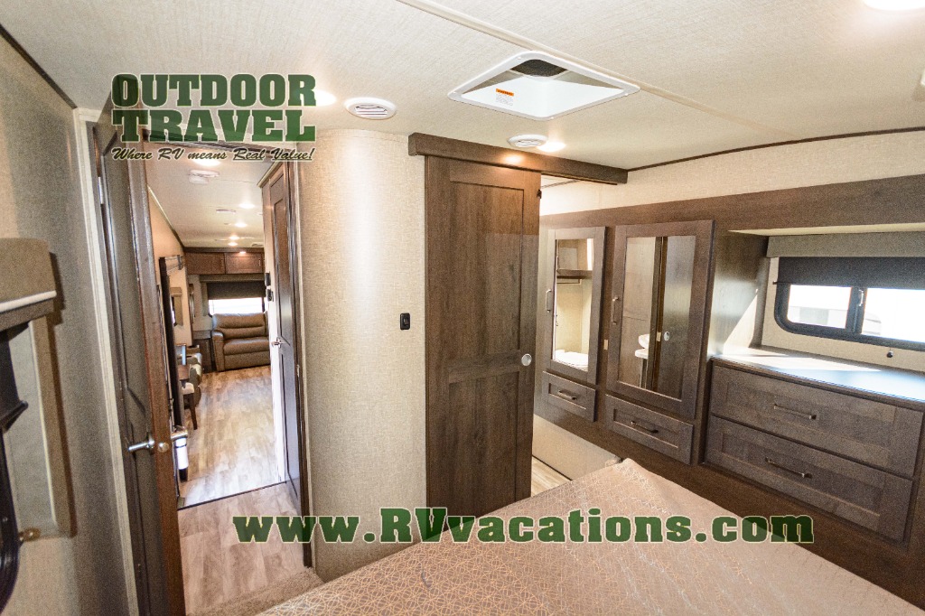 Whether you travel for pleasure or work, you will love the spacious main living and kitchen area with a rear tri-fold sofa that doubles as extra sleeping space, and the theatre seating directly across from the entertainment center with a 40" LED HDTV and a fireplace below. The kitchen island will make meal prepping and drying the dishes easier and the hutch is the perfect place to place your picture frames, nice dishes, and extra cooking items, plus the pantry is big enough to store all of your favorite snacks, dry ingredients and such. Outside you can enjoy two electric awnings that provide protection from the elements as you relax and visit with other RVers, and your camping chairs can easily be stored in the pass-through compartment. The double entry bathroom is convenient especially at night when you can slide the door to enter from the front master bedroom. You will find plenty of storage for your clothing and things, plus the bedroom slide out gives you drawers and linen storage that stretches into the full bathroom.
