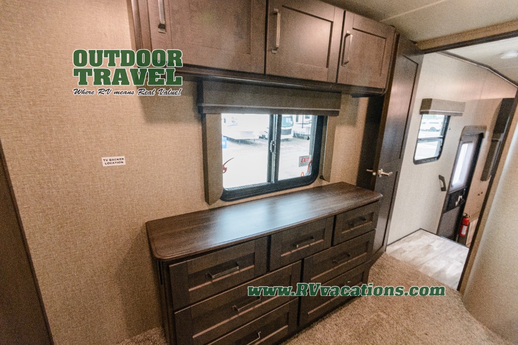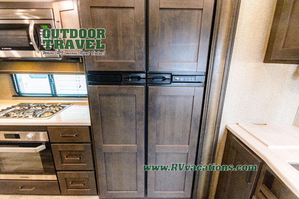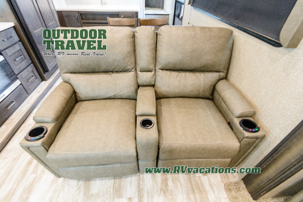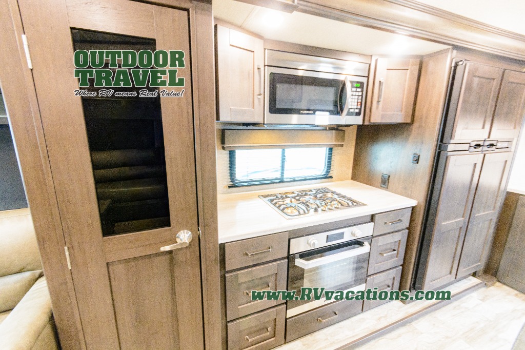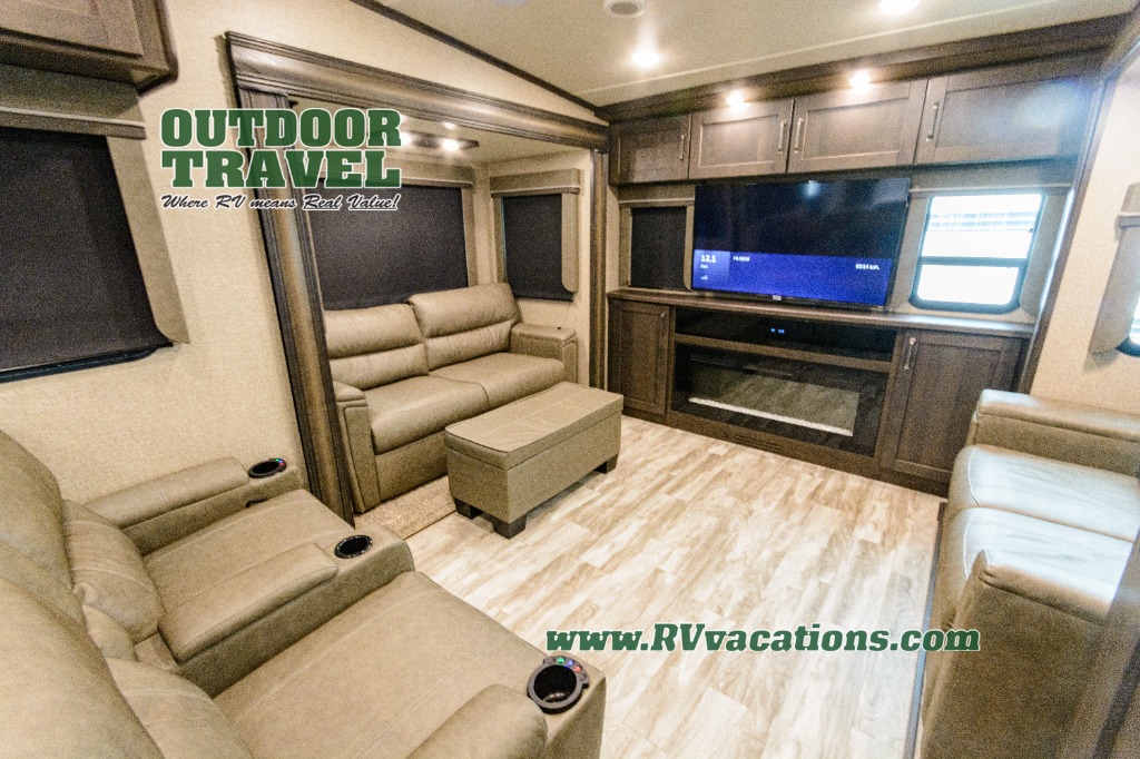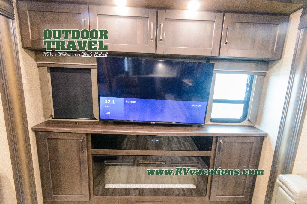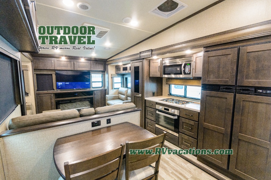 Looking for a separate living area from the kitchen in your next RV? Do you want to be able to entertain while camping? Well this fifth wheel has what you want, plus much more! The rear living area has two opposing tri-fold sofas, and theatre seating directly across from the rear entertainment center with a 50" LED HDTV and a 48" fireplace below it, plus windows and storage. The middle kitchen area offers the cook a large pantry, a 16 cu. ft. refrigerator, and extra counter space around the deep seated stainless steel sink. And there is a free standing adjustable dinette with a storage ottoman and more counter space nearby giving you a place for your things while dining, playing game or even working. The full bathroom can be accessed from the hallway that leads to the front bedroom which offers a queen bed slide or choose a king option, a dresser with window above, plus a full wall wardrobe with a place to add a washer/dryer option to keep everything clean while away.