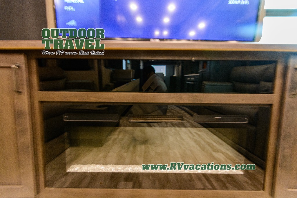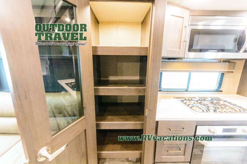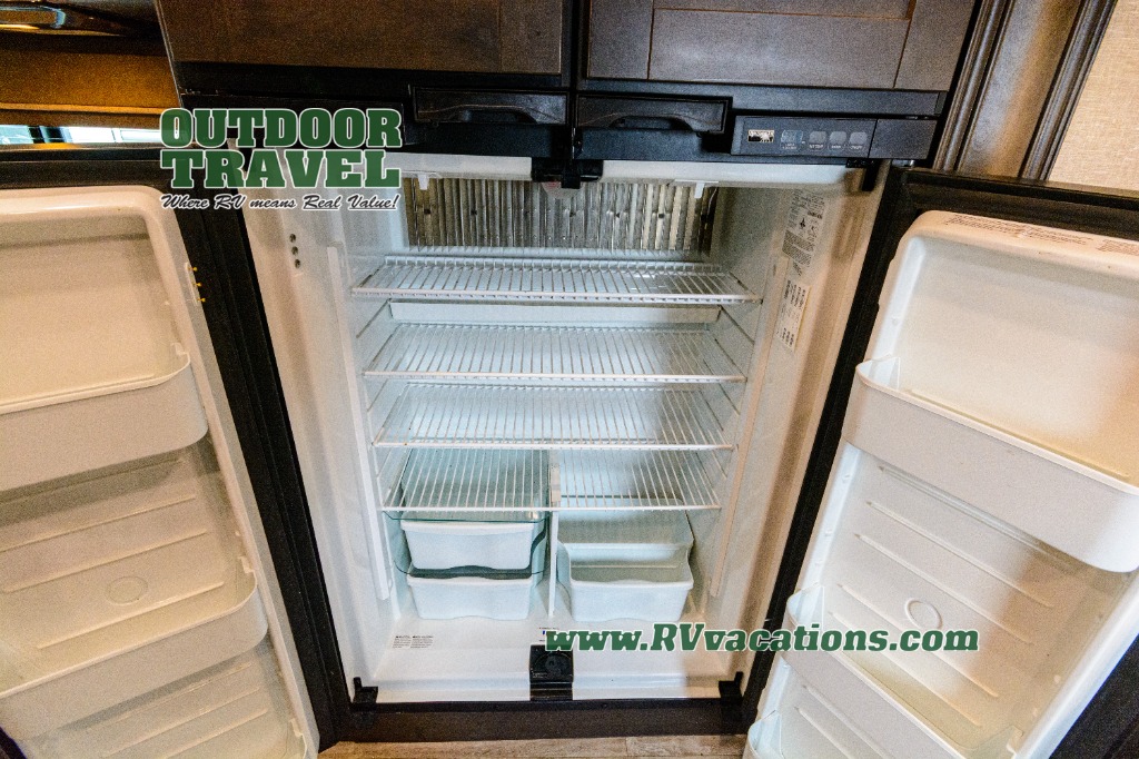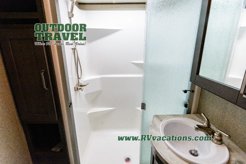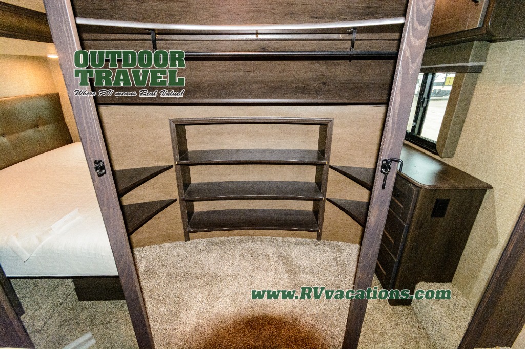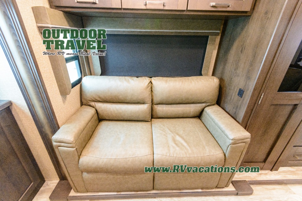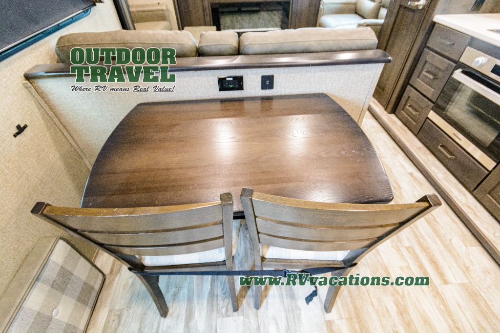 Looking for a separate living area from the kitchen in your next RV? Do you want to be able to entertain while camping? Well this fifth wheel has what you want, plus much more! The rear living area has two opposing tri-fold sofas, and theatre seating directly across from the rear entertainment center with a 50" LED HDTV and a 48" fireplace below it, plus windows and storage. The middle kitchen area offers the cook a large pantry, a 16 cu. ft. refrigerator, and extra counter space around the deep seated stainless steel sink. And there is a free standing adjustable dinette with a storage ottoman and more counter space nearby giving you a place for your things while dining, playing game or even working. The full bathroom can be accessed from the hallway that leads to the front bedroom which offers a queen bed slide or choose a king option, a dresser with window above, plus a full wall wardrobe with a place to add a washer/dryer option to keep everything clean while away.
