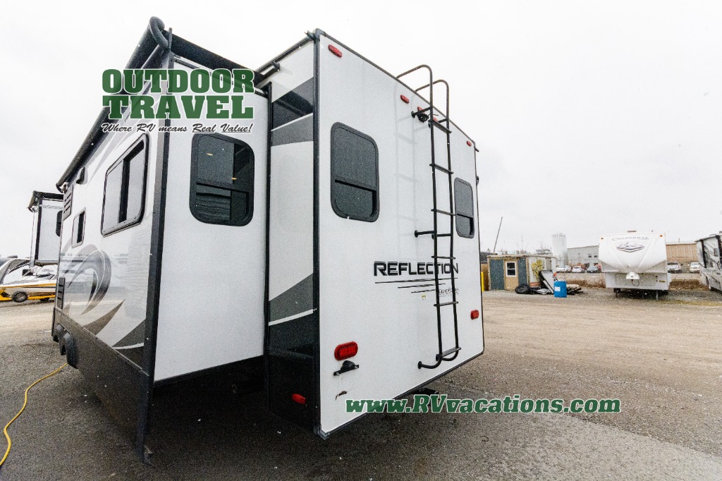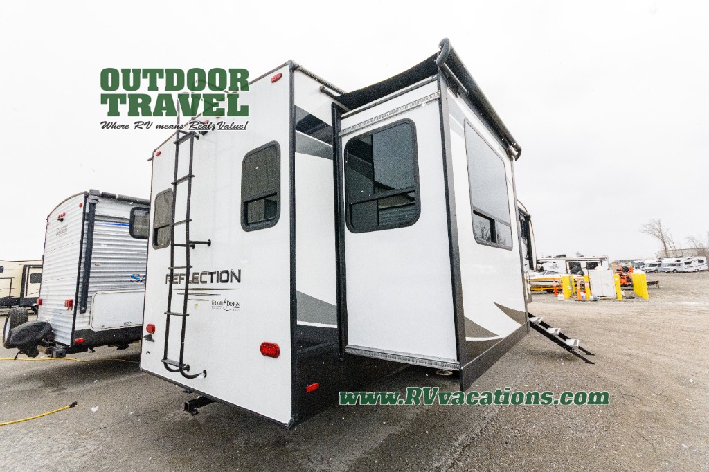 With any Reflection fifth wheels by Grand Design, you will have a 165W solar panel for off-grid camping and a 50 Amp charge controller and inverter prep, a Max Turn radius front cap for easy towing around town and into your campsite, a Universal All-In-One Docking Station, unobstructed pass-through storage, and Goodyear E-rated tires. Some other top features include a chef's kitchen with a 30" stainless steel microwave and residential cooktop, a USB charging station, and the ductless "Evenflow" heating system with no vents in the floor to collect debris. Each is constructed of high gloss gel coat exterior sidewalls, residential 5" truss rafters, walk-on roof decking, a fiberglass and radiant foil roof and front cap insulation plus laminated aluminum framed side walls, rear wall, roof and end walls in slide rooms. Choose luxury, value and towability over all the others, take home a Reflection of your good taste!