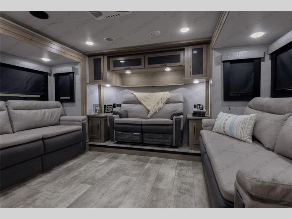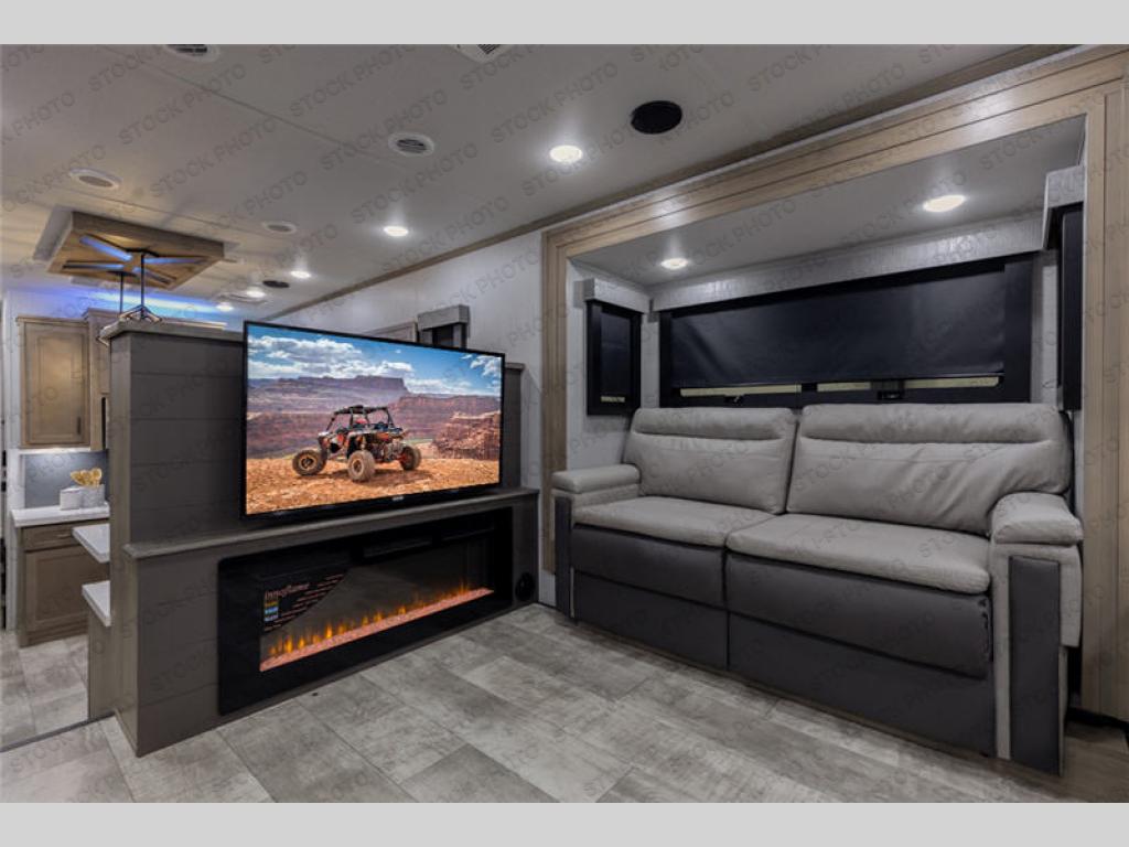 This toy hauler has all the space you need to enjoy a weekend with friends, or a week long family vacation. The fuel station will certainly keep the toys going, and the inside amenities including a full featured kitchen with butler pantry, 18 cu. ft. refrigerator, cooktop and oven, plus microwave and island with bar stools will make mealtime easy. You can easily whip up family favorites to enjoy outside or inside gathered at the free standing dining table with four chairs, and have snacks in the front living area with two 70" tri-fold sofas, plus theater seating or optional lounge chairs instead. The rear master suite is a couple of steps up and features a queen bed or optional king, a slide out wardrobe with drawers beneath, plus easy entry into the full bath with skylight over the shower, and a seat for relaxing after a long day of trail riding. There is a bed lift system that raises the bed to provide up to 77" of headroom space in the garage area below where you can easily load up your favorite ride on toys using the rear ramp door.