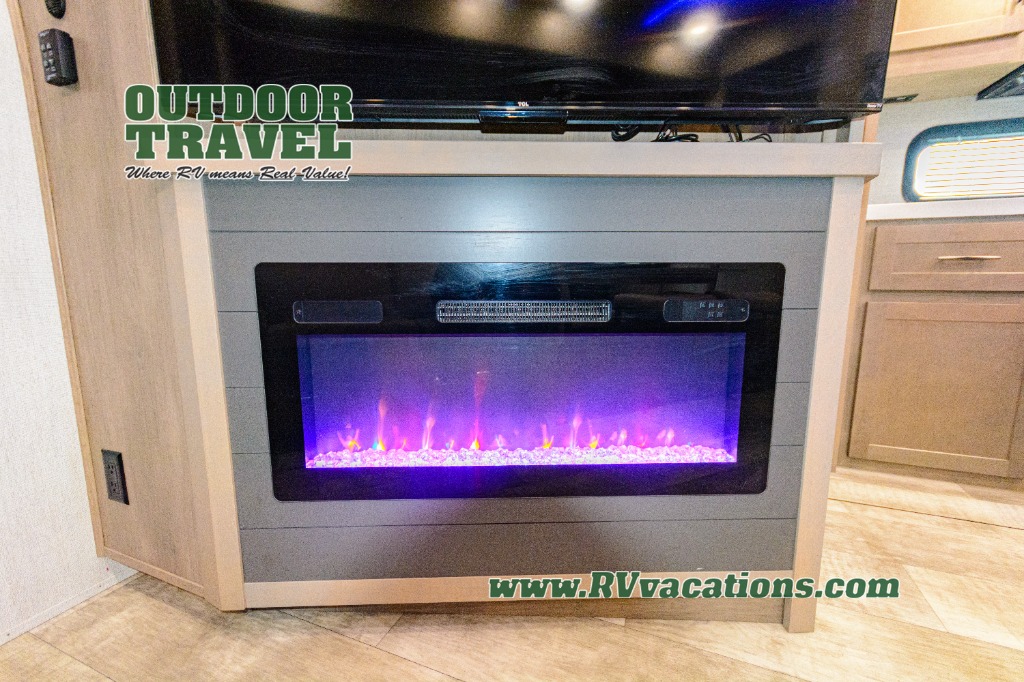 Load up your toys, your clothes and food and start your adventure as you smoothing tow this fifth wheel to your campsite. You will enjoy the Fast Ramp rear ramp door, the Ram-Air garage vents on both sides, and the 2,500 lb. rated flush-mount tie-downs to keep your toys secure. You will surely appreciate the full bathroom and LED TV, plus the option to add Happi-Jac rollover sofas/table with a top bed. The main area provides a living and kitchen area with a 49" LED TV and a fireplace, theatre seating and a free standing dinette, plus full kitchen amenities. There is also a new Smart Sink with a removable cutting board, produce strainer and glass rinser you are sure to love. Head up front to use the full bathroom with a one-piece fiberglass shower with a glass door and teak seat, and fall quickly to sleep on your own queen bed or choose a king option in the front bedroom.