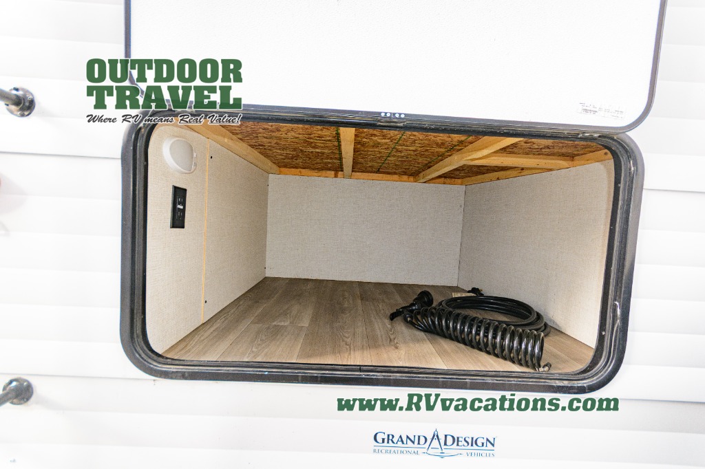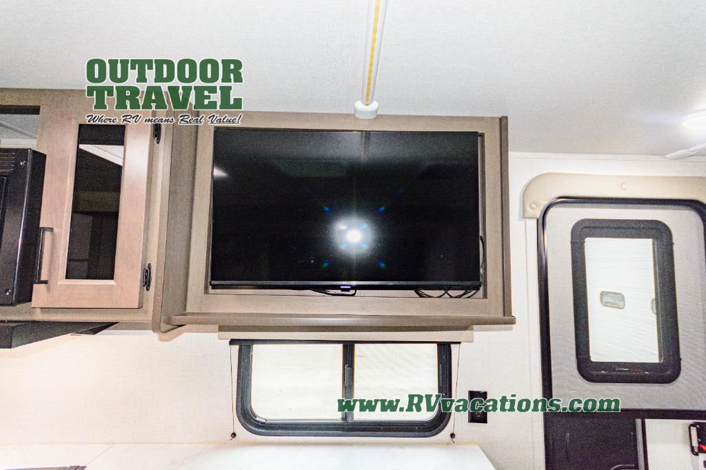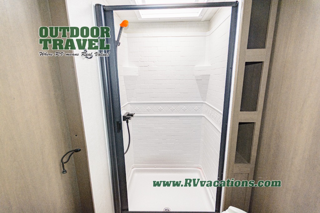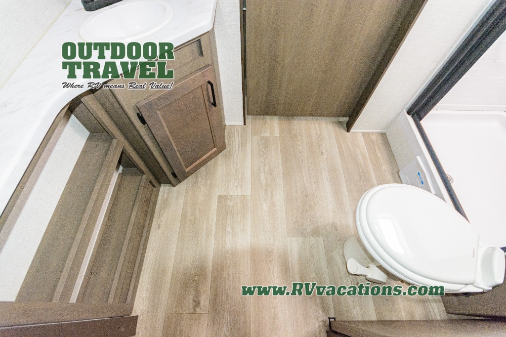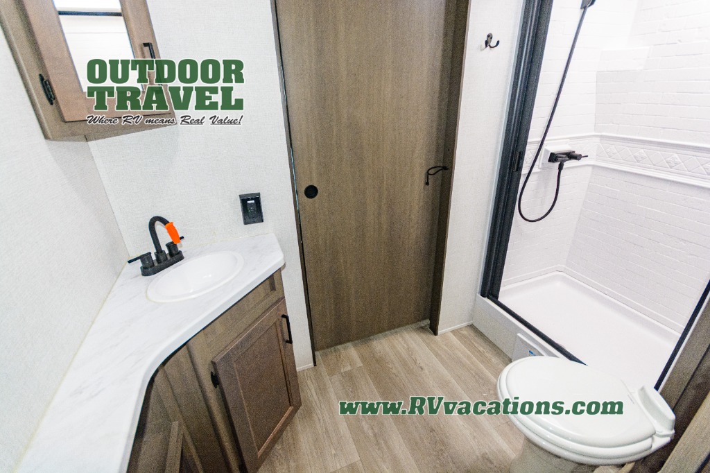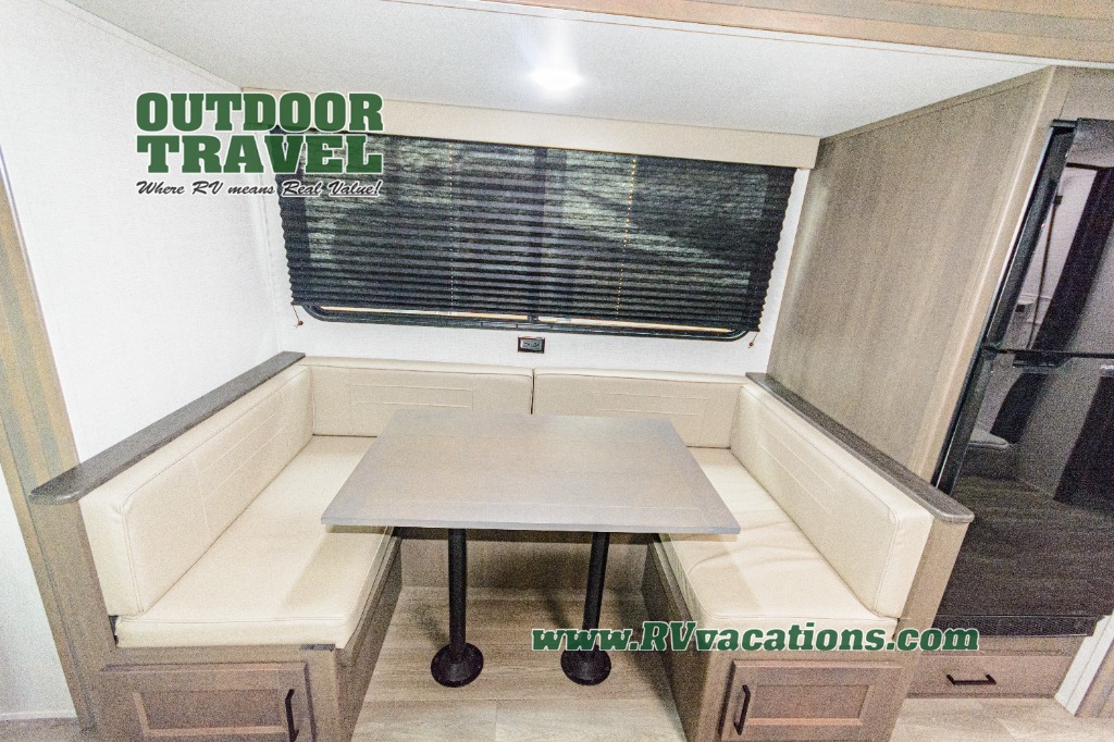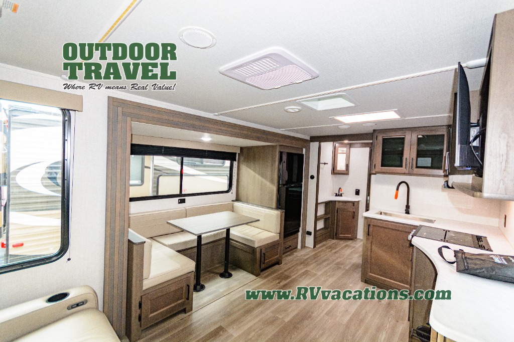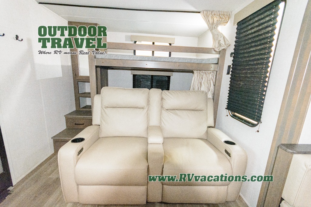 Are you ready to camp in comfort with your family or friends? This travel trailer allows you to do just that! There are double-size bunks in the back with step storage for books or board games. There is also a closet here to keep clothes wrinkle-free. The large slide features a U-Shaped dinette which is perfect for everyone to gather for a meal or games, and there is also theater seating adjacent to the slide. This model features a walk-through bath that leads to the front master bedroom. You'll love the queen bed here, overhead storage, and your own exterior entry door for convenience.