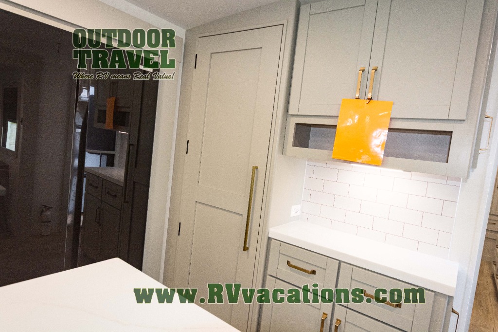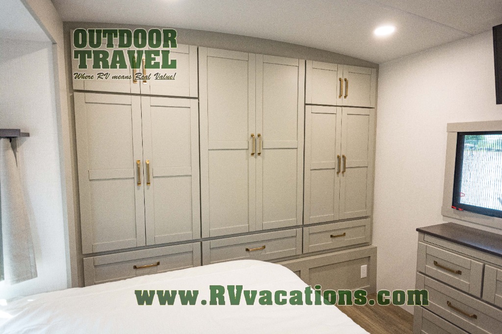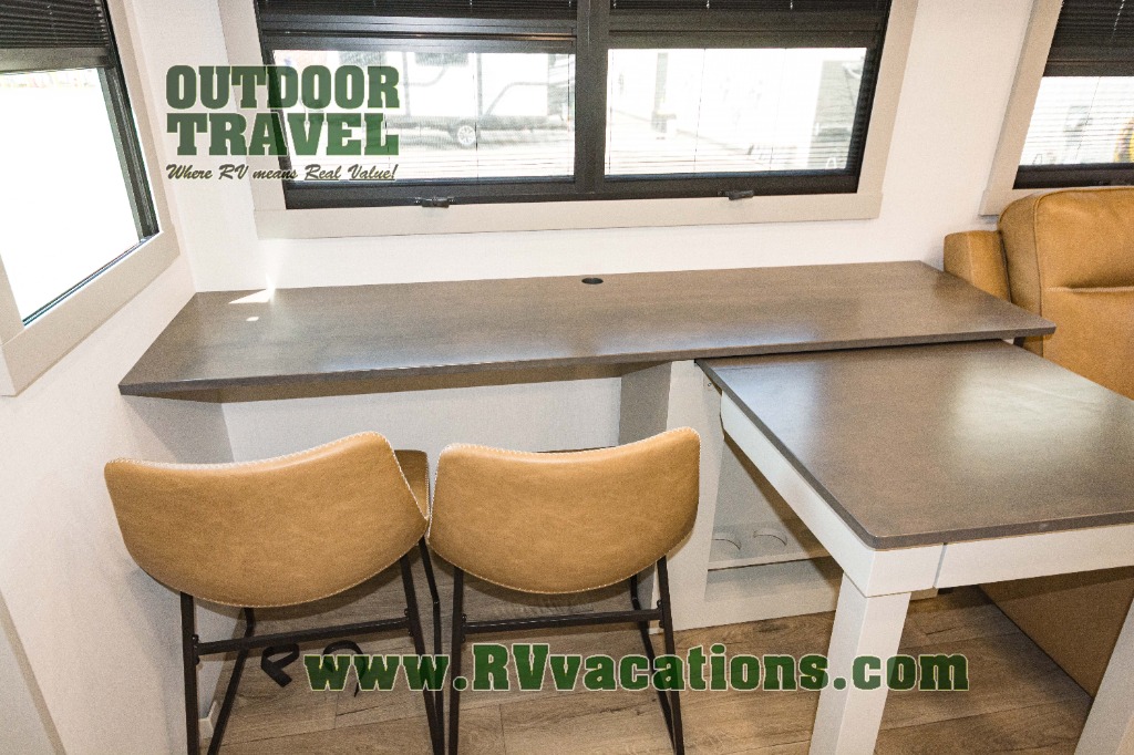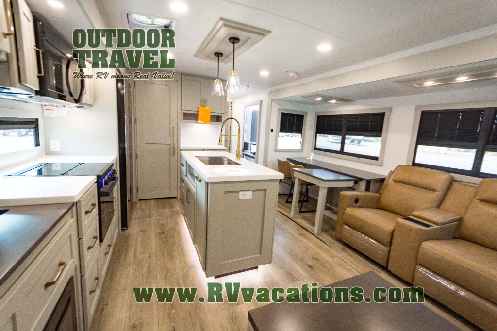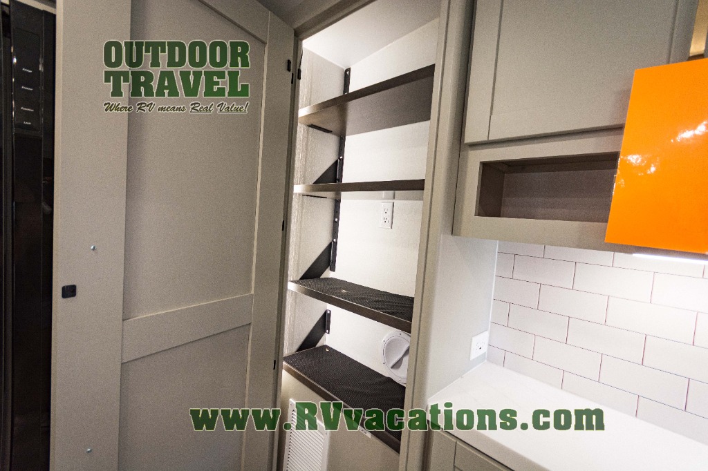 You will love all the space and features in this travel trailer! A luxurious rear living room offers plenty of room to spread out, with a 72" tri-fold sofa plus theater seats, all arranged with a perfect view of the 50" TV over the fireplace. A central kitchen area includes an island with hidden pet bowls. Find even more storage with the hutch plus pantry with adjustable shelves. The front bedroom comes with a king bed, but if you'd like you can upgrade to a king for even more room. No matter which you choose, you will enjoy watching the 32" bedroom TV. The full-width wardrobe has room for all of your clothes and also includes prep for an optional washer and dryer. And the full bath includes a 30" x 42" one-piece fiberglass shower. Outside you'll enjoy two awnings, pass-through storage, and LED chassis lighting.